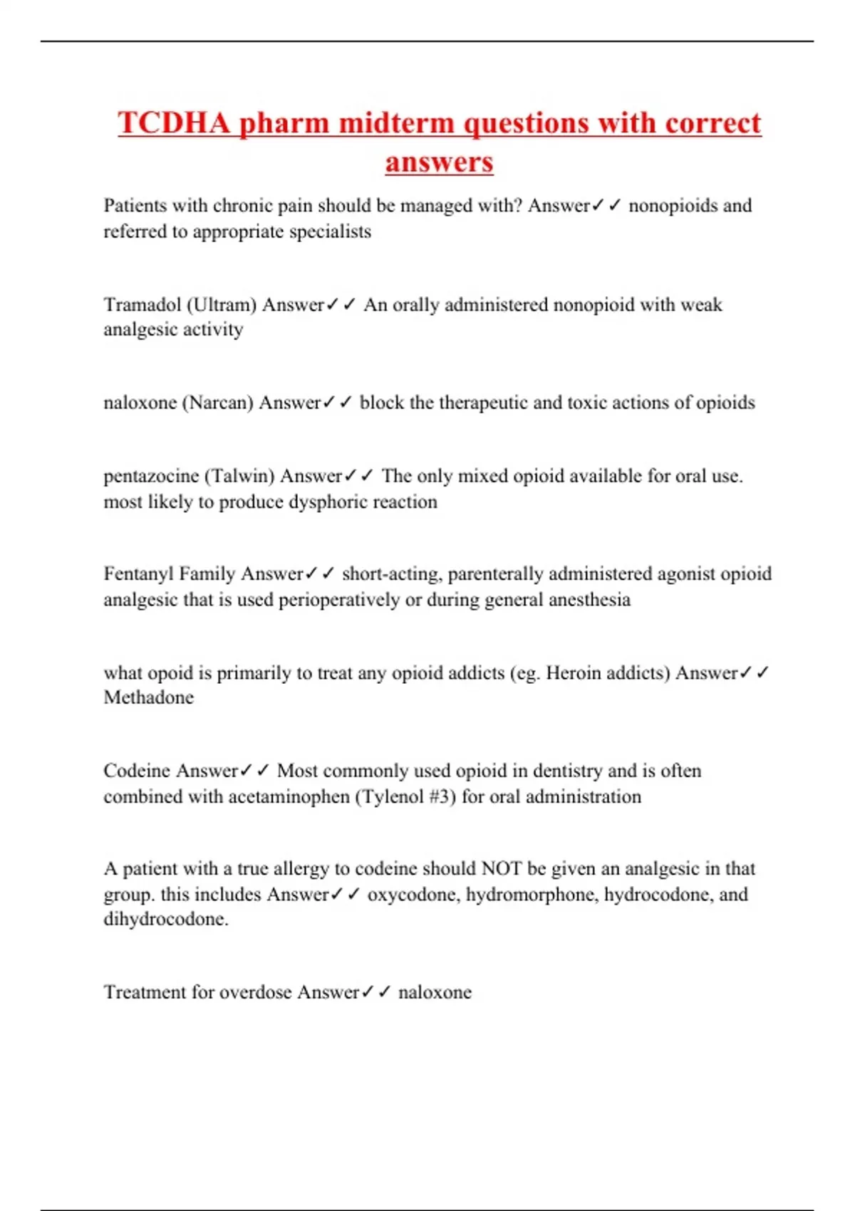 Patients with chronic pain should be managed with? Answer nonopioids and referred to appropriate specialists Tramadol (Ultram) Answer An orally administered nonopioid with weak analgesic activity naloxone (Narcan) Answer block the therapeutic and toxic actions of opioids pentazocine (Talwin) Answer The only mixed opioid available for oral use. most likely to produce dysphoric reaction Fentanyl Family Answer short-acting, parenterally administered agonist opioid analgesic that is used perioperatively or during general anesthesia what opoid is primarily to treat any opioid addicts (eg. Heroin addicts) Answer Methadone Codeine Answer Most commonly used opioid in dentistry and is often combined with acetaminophen (Tylenol #3) for oral administration A patient with a true allergy to codeine should NOT be given an analgesic in that group. this includes Answer oxycodone, hydromorphone, hydrocodone, and dihydrocodone.