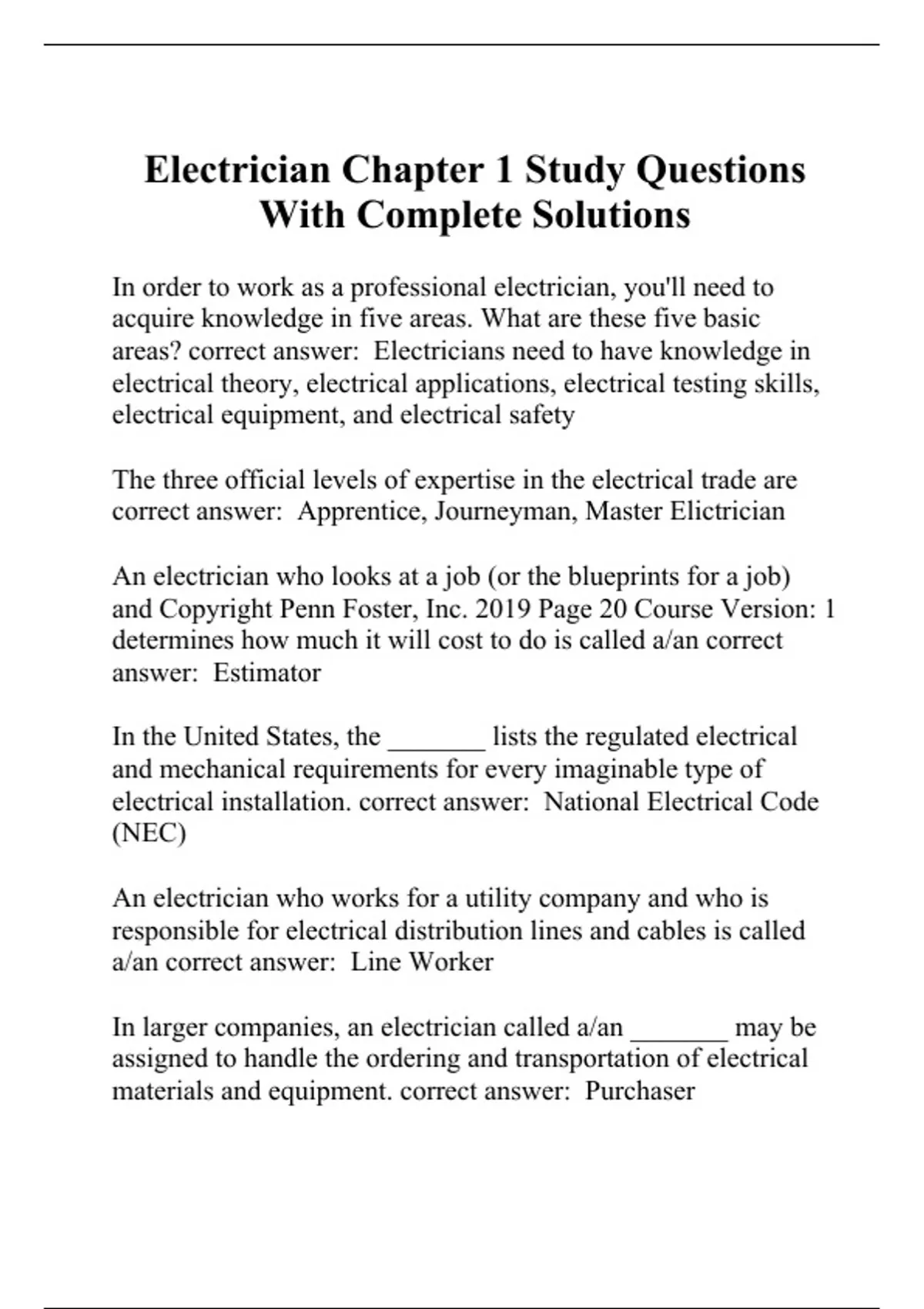Electrician Chapter 1 Study Questions With Complete Solutions