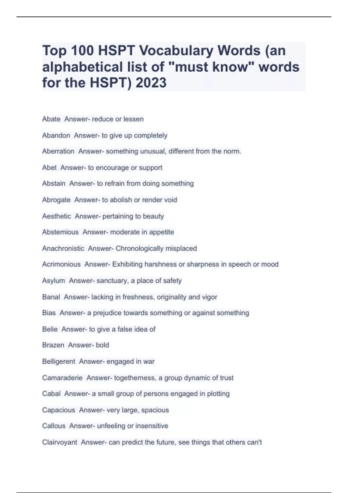 Top 100 HSPT Vocabulary Words (an alphabetical list of "must know" words for the HSPT) 2023