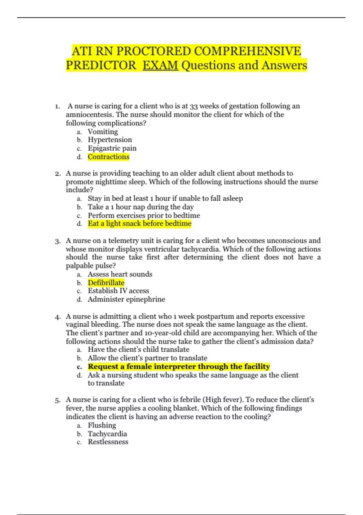 ATI RN PROCTORED COMPREHENSIVE PREDICTOR EXAM Questions and Answers 1. A nurse is caring for a client who is at 33 weeks of gestation following an amniocentesis. The nurse should monitor the client for which of the following complications? a. Vomiting b. Hypertension c. Epigastric pain d. Contractions 2. A nurse is providing teaching to an older adult client about methods to promote nighttime sleep. Which of the following instructions should the nurse include? a. Stay in bed at least 1 hour if unable to fall asleep b. Take a 1 hour nap during the day c. Perform exercises prior to bedtime d. Eat a light snack before bedtime 3. A nurse on a telemetry unit is caring for a client who becomes unconscious and whose monitor displays ventricular tachycardia. Which of the following actions should the nurse take first after determining the client does not have a palpable pulse? a. Assess heart sounds b. Defibrillate c. Establish IV access d. Administer epinephrine 4. A nurse is admitting a client who 1 week postpartum and reports excessive vaginal bleeding. The nurse does not speak the same language as the client. The client’s partner and 10-year-old child are accompanying her. Which of the following actions should the nurse take to gather the client’s admission data? a. Have the client’s child translate b. Allow the client’s partner to translate c. Request a female interpreter through the facility d. Ask a nursing student who speaks the same language as the client to translatec