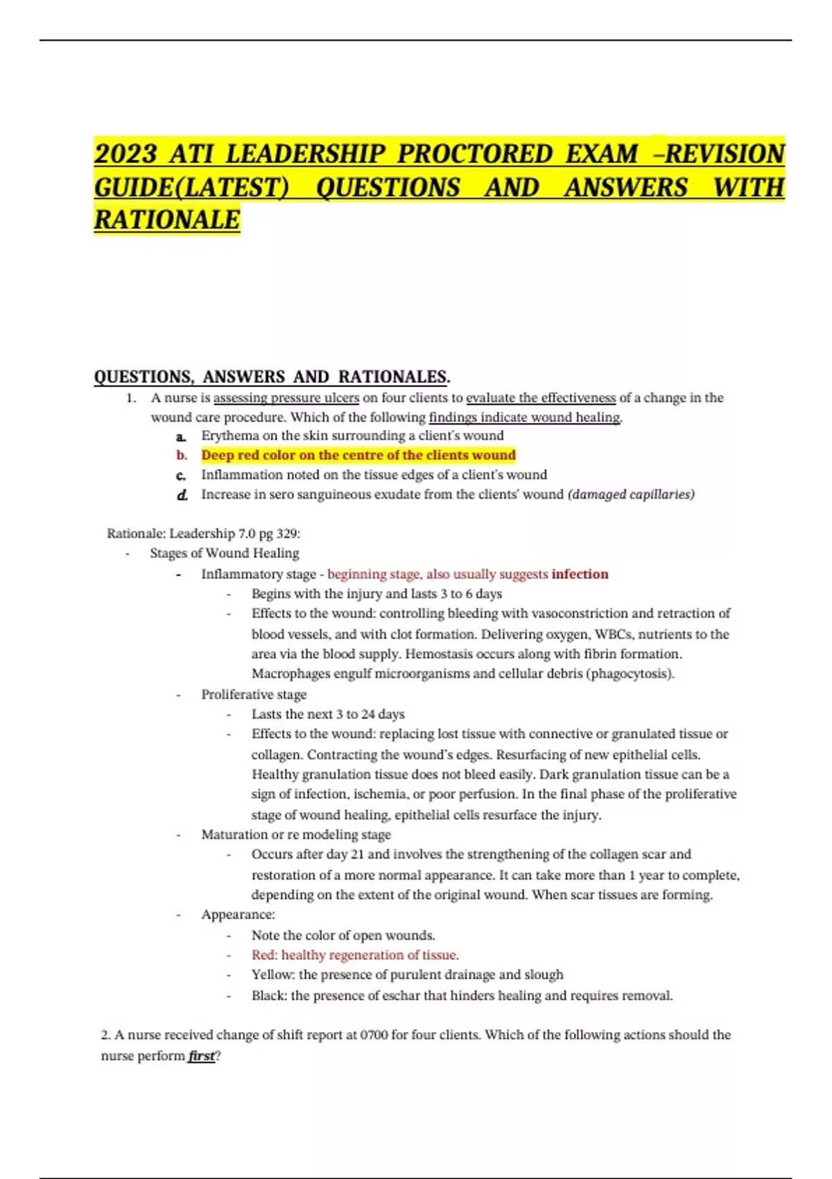 2023 ATI LEADERSHIP PROCTORED EXAM –REVISION GUIDE(LATEST) QUESTIONS AND ANSWERS WITH RATIONALE QUESTIONS, ANSWERS AND RATIONALES. 1. A nurse is assessing pressure ulcers on four clients to evaluate the effectiveness of a change in the wound care procedure. Which of the following findings indicate wound healing. a. Erythema on the skin surrounding a client's wound b. Deep red color on the centre of the clients wound c. Inflammation noted on the tissue edges of a client's wound d. Increase in sero sanguineous exudate from the clients' wound (damaged capillaries) Rationale: Leadership 7.0 pg 329: - Stages of Wound Healing - Inflammatory stage - beginning stage, also usually suggests infection - Begins with the injury and lasts 3 to 6 days - Effects to the wound: controlling bleeding with vasoconstriction and retraction of blood vessels, and with clot formation. Delivering oxygen, WBCs, nutrients to the area via the blood supply. Hemostasis occurs along with fibrin formation. Macrophages engulf microorganisms and cellular debris (phagocytosis). - Proliferative stage - Lasts the next 3 to 24 days - Effects to the wound: replacing lost tissue with connective or granulated tissue or collagen. Contracting the wound’s edges. Resurfacing of new epithelial cells. Healthy granulation tissue does not bleed easily. Dark granulation tissue can be a sign of infection, ischemia, or poor perfusion. In the final phase of the proliferative stage of wound healing, epithelial cells resurface the injury. - Maturation or re modeling stage - Occurs after day 21 and involves the strengthening of the collagen scar and restoration of a more normal appearance. It can take more than 1 year to complete, depending on the extent of the original wound. When scar tissues are forming. - Appearance: - Note the color of open wounds. - Red: healthy regeneration of tissue. - Yellow: the presence of purulent drainage and slough - Black: the presence of eschar that hinders healing and requires removal.