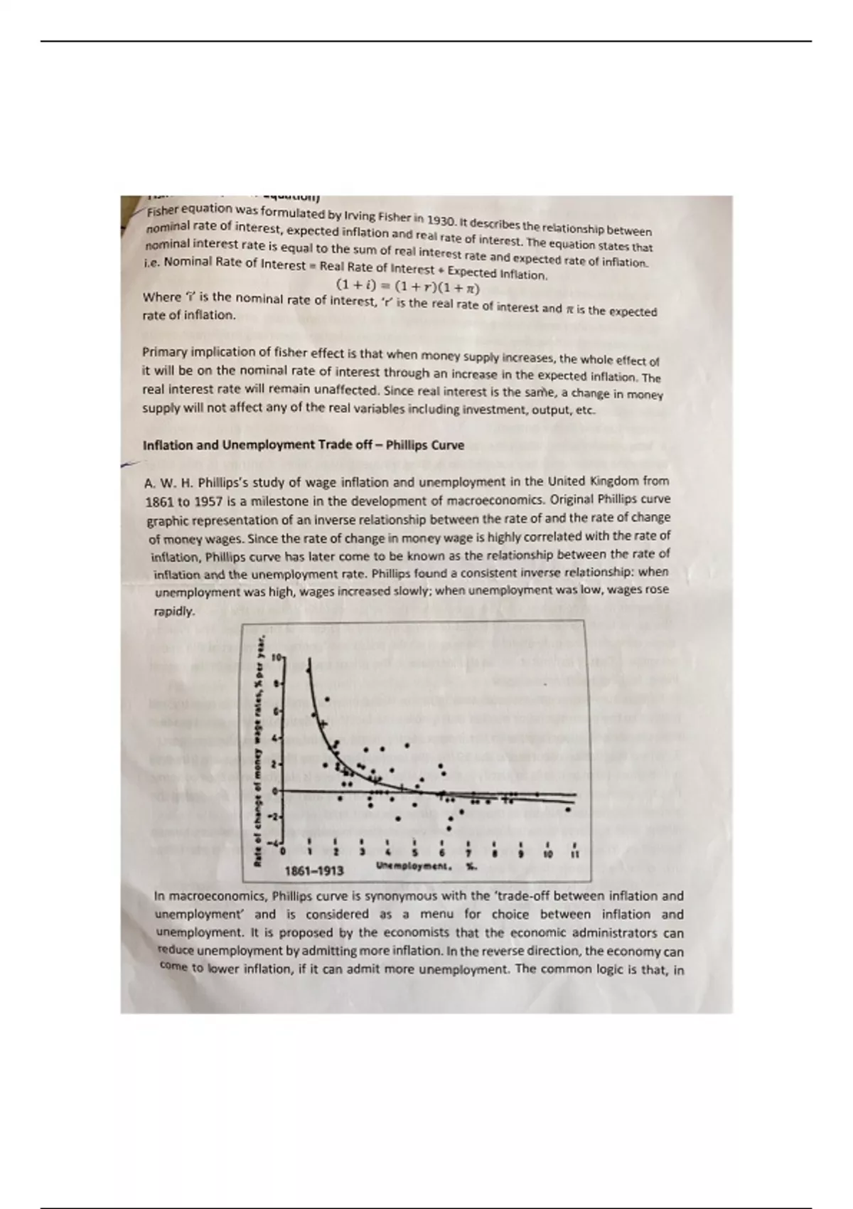 It includes notes about philips curve and Fishers Equation. It also explains Inflation and unemployment Trade off based on philips Curve and also factors behind non linearity of the philips curve and limitations of Philips curve