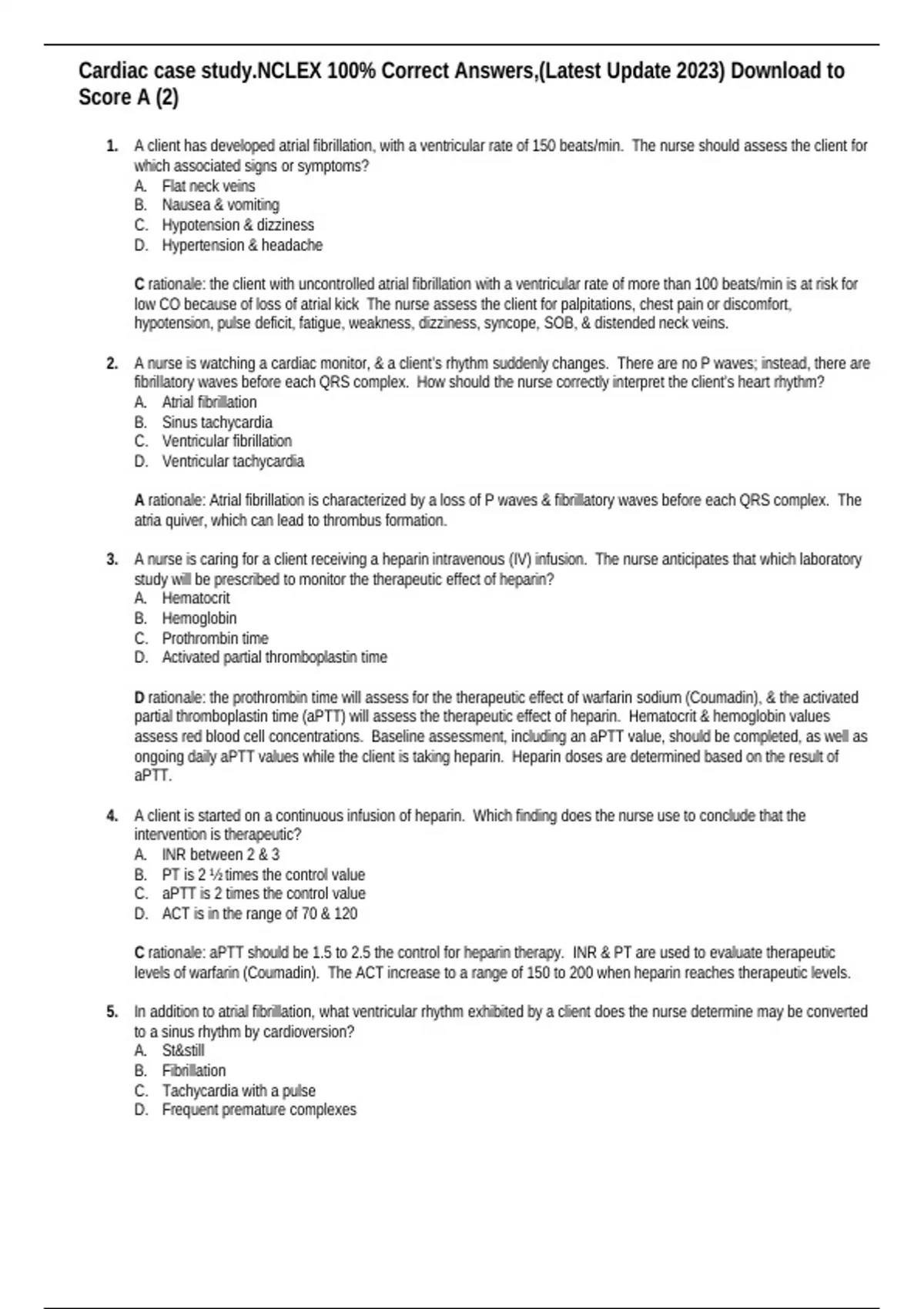 Cardiac case study.NCLEX 100% Correct Answers,(Latest Update 2023) Download to Score A (2)