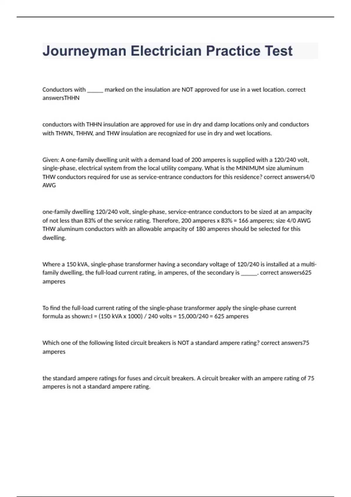 Conductors with _____ marked on the insulation are NOT approved for use in a wet location. correct answersTHHN conductors with THHN insulation are approved for use in dry and damp locations only and conductors with THWN, THHW, and THW insulation are recognized for use in dry and wet locations. Given: A one-family dwelling unit with a demand load of 200 amperes is supplied with a 120/240 volt, single-phase, electrical system from the local utility company. What is the MINIMUM size aluminum THW conductors required for use as service-entrance conductors for this residence? correct answers4/0 AWG one-family dwelling 120/240 volt, single-phase, service-entrance conductors to be sized at an ampacity of not less than 83% of the service rating. Therefore, 200 amperes x 83% = 166 amperes; size 4/0 AWG THW aluminum conductors with an allowable ampacity of 180 amperes should be selected for this dwelling.