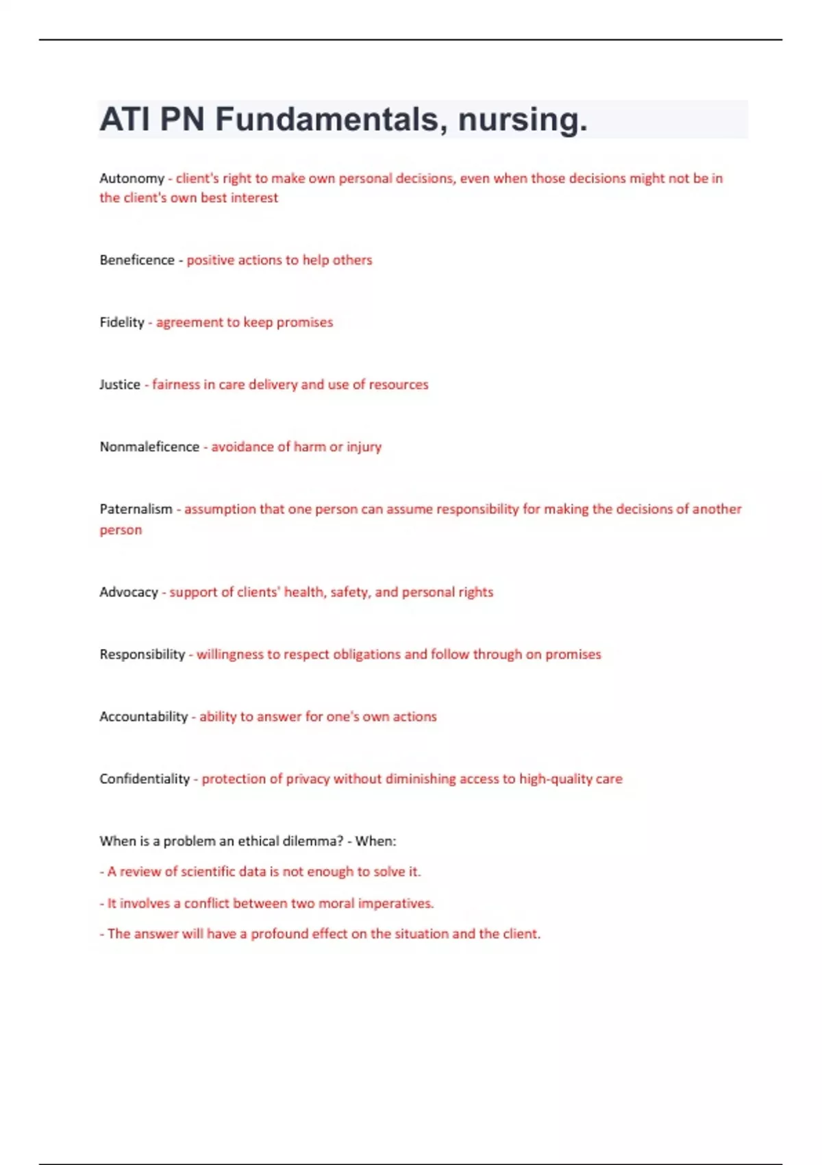 Autonomy - client's right to make own personal decisions, even when those decisions might not be in the client's own best interest Beneficence - positive actions to help others Fidelity - agreement to keep promises Justice - fairness in care delivery and use of resources Nonmaleficence - avoidance of harm or injury Paternalism - assumption that one person can assume responsibility for making the decisions of another person Advocacy - support of clients' health, safety, and personal rights Responsibility - willingness to respect obligations and follow through on promises Accountability - ability to answer for one's own actions Confidentiality - protection of privacy without diminishing access to high-quality care When is a problem an ethical dilemma? - When: - A review of scientific data is not enough to solve it. - It involves a conflict between two moral imperatives. - The answer will have a profound effect on the situation and the client.Ethical decision making - Process that requires striking a balance between science and morality A nurse is caring for a client who decides not to have surgery despite significant blockages in his coronary arteries. The nurse understands that this client's choice is an example of which of the following ethical principles? A. Fidelity B. Autonomy C. Justice D. Nonmaleficence - B. Autonomy In this situation, the client is exercising his right to make his own personal decision about surgery, regardless of others' opinions of what is "best" for him. This is an example of autonomy. A nurse offers pain medication to a client who is postoperative prior to ambulation. The nurse understands that this aspect of care delivery is an example of which of the following ethical principles? A. Fidelity B. Autonomy C. Justice D. Beneficence - D. Beneficence