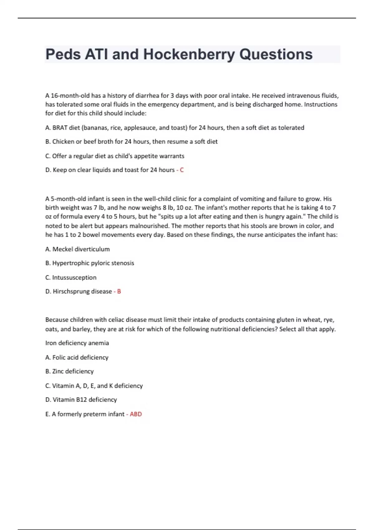 A 16-month-old has a history of diarrhea for 3 days with poor oral intake. He received intravenous fluids, has tolerated some oral fluids in the emergency department, and is being discharged home. Instructions for diet for this child should include: A. BRAT diet (bananas, rice, applesauce, and toast) for 24 hours, then a soft diet as tolerated B. Chicken or beef broth for 24 hours, then resume a soft diet C. Offer a regular diet as child's appetite warrants D. Keep on clear liquids and toast for 24 hours - C A 5-month-old infant is seen in the well-child clinic for a complaint of vomiting and failure to grow. His birth weight was 7 lb, and he now weighs 8 lb, 10 oz. The infant's mother reports that he is taking 4 to 7 oz of formula every 4 to 5 hours, but he "spits up a lot after eating and then is hungry again." The child is noted to be alert but appears malnourished. The mother reports that his stools are brown in color, and he has 1 to 2 bowel movements every day. Based on these findings, the nurse anticipates the infant has: A. Meckel diverticulum B. Hypertrophic pyloric stenosis C. Intussusception D. Hirschsprung disease - B Because children with celiac disease must limit their intake of products containing gluten in wheat, rye, oats, and barley, they are at risk for which of the following nutritional deficiencies? Select all that apply. Iron deficiency anemia A. Folic acid deficiency B. Zinc deficiency C. Vitamin A, D, E, and K deficiency D. Vitamin B12 deficiency E. A formerly preterm infant - ABDA formerly preterm infant who had surgery for necrotizing enterocolitis is now 6 months old and has short-bowel syndrome. He is unable to absorb most nutrients taken by mouth and is totally dependent on parenteral nutrition, which he receives via a central venous catheter. The clinic nurse following this infant is aware that this infant should be closely observed for the development of: A. Gastroesophageal reflux B. Chronic diarrhea C. Cholestasis D. Failure to thrive - C The nurse caring for a 4-month-old infant with biliary atresia and significant urticaria can anticipate administering: A. Diphenhydramine B. Ursodiol (ursodeoxycholic acid) C. Loratadine D. Zantac - B Hepatitis A virus is transmitted by which of the following? Select all that apply. A. Breast milk from mother with HAV B. Ingestion of contaminated food C. Fecal-oral route D. Casual contact with infected person E. Blood transfusion - BC A nurse is caring for a child who has had watery diarrhea for the past 3 days.Which of the following is an action for the nurse to take? Offer chicken broth Initiate oral rehydration therapy Start hypertonic IV solution Keep NPO - BA nurse is caring for a child who is suspected to have Enterobius vermicularis. Which of the following actions should the nurse take? Perform a tape test Collect stool specimen for culture Test the stool for occult blood Initiate IV fluids - A A nurse is assessing a child who has a rotavirus infection. Which of the following are expected findings? (Select all that apply) Fever Vomiting Watery stools Blood stools Confusion - ABC A nurse is teaching a group of parents about Salmonella. Which of the following information should the nurse include in the teaching? (Select all that apply) Incubation period is nonspecific It is a bacterial infection Bloody diarrhea is common Transmission can be from house pets - BCD Antibiotics are used for treatment A nurse is teaching a group of caregivers a