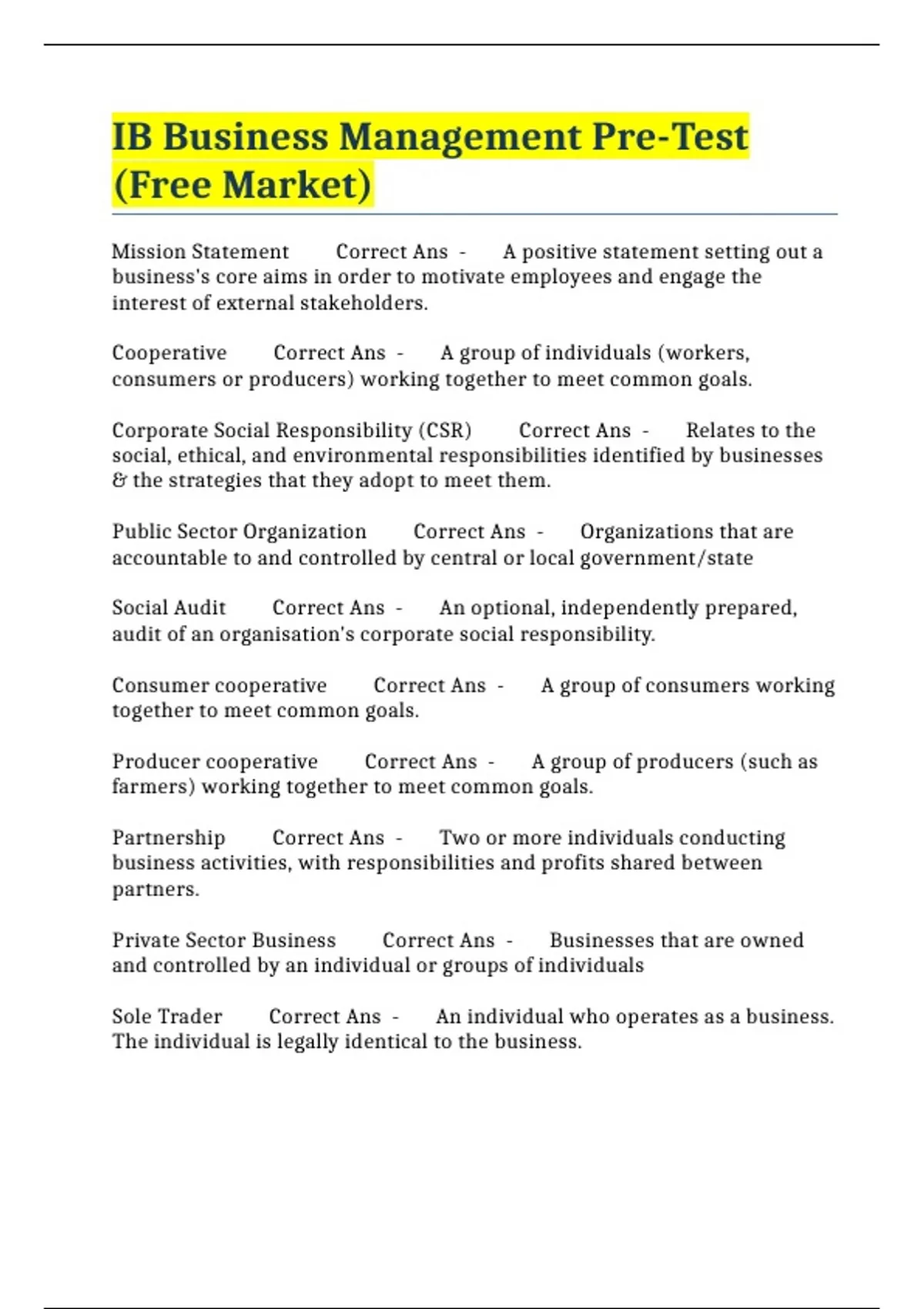 IB Business Management Pre-Test (Free Market)