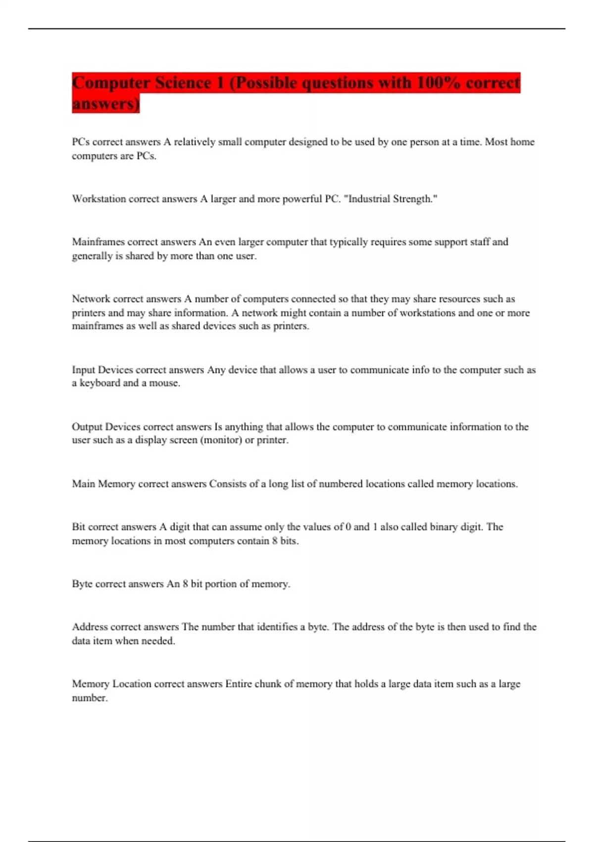 Computer Science 1 (Possible questions with 100% correct answers)