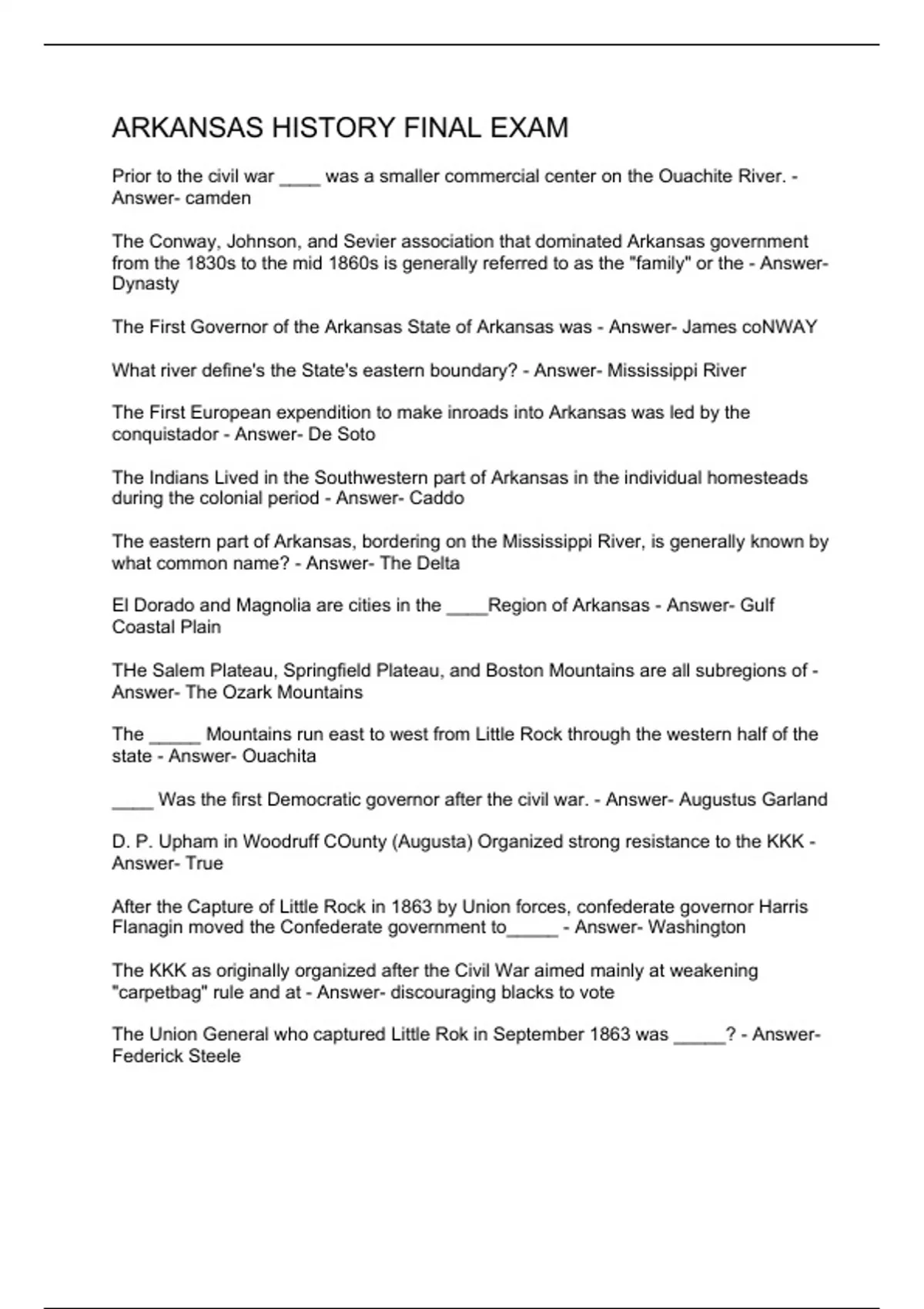Prior to the civil war ____ was a smaller commercial center on the Ouachite River. - Answer- camden The Conway, Johnson, and Sevier association that dominated Arkansas government from the 1830s to the mid 1860s is generally referred to as the "family" or the - Answer- Dynasty The First Governor of the Arkansas State of Arkansas was - Answer- James coNWAY What river define's the State's eastern boundary? - Answer- Mississippi River The First European expendition to make inroads into Arkansas was led by the conquistador - Answer- De Soto The Indians Lived in the Southwestern part of Arkansas in the individual homesteads during the colonial period - Answer- Caddo The eastern part of Arkansas, bordering on the Mississippi River, is generally known by what common name? - Answer- The Delta El Dorado and Magnolia are cities in the ____Region of Arkansas - Answer- Gulf Coastal Plain THe Salem Plateau, Springfield Plateau, and Boston Mountains are all subregions of - Answer- The Ozark Mountains The _____ Mountains run east to west from Little Rock through the western half of the state - Answer- Ouachita ____ Was the first Democratic governor after the civil war. - Answer- Augustus Garland D. P. Upham in Woodruff COunty (Augusta) Organized strong resistance to the KKK - Answer- True After the Capture of Little Rock in 1863 by Union forces, confederate governor Harris Flanagin moved the Confederate government to_____ - Answer- Washington The KKK as originally organized after the Civil War aimed mainly at weakening "carpetbag" rule and at - Answer- discouraging blacks to vote The Union General who captured Little Rok in September 1863 was _____? - Answer- Federick Steele Th