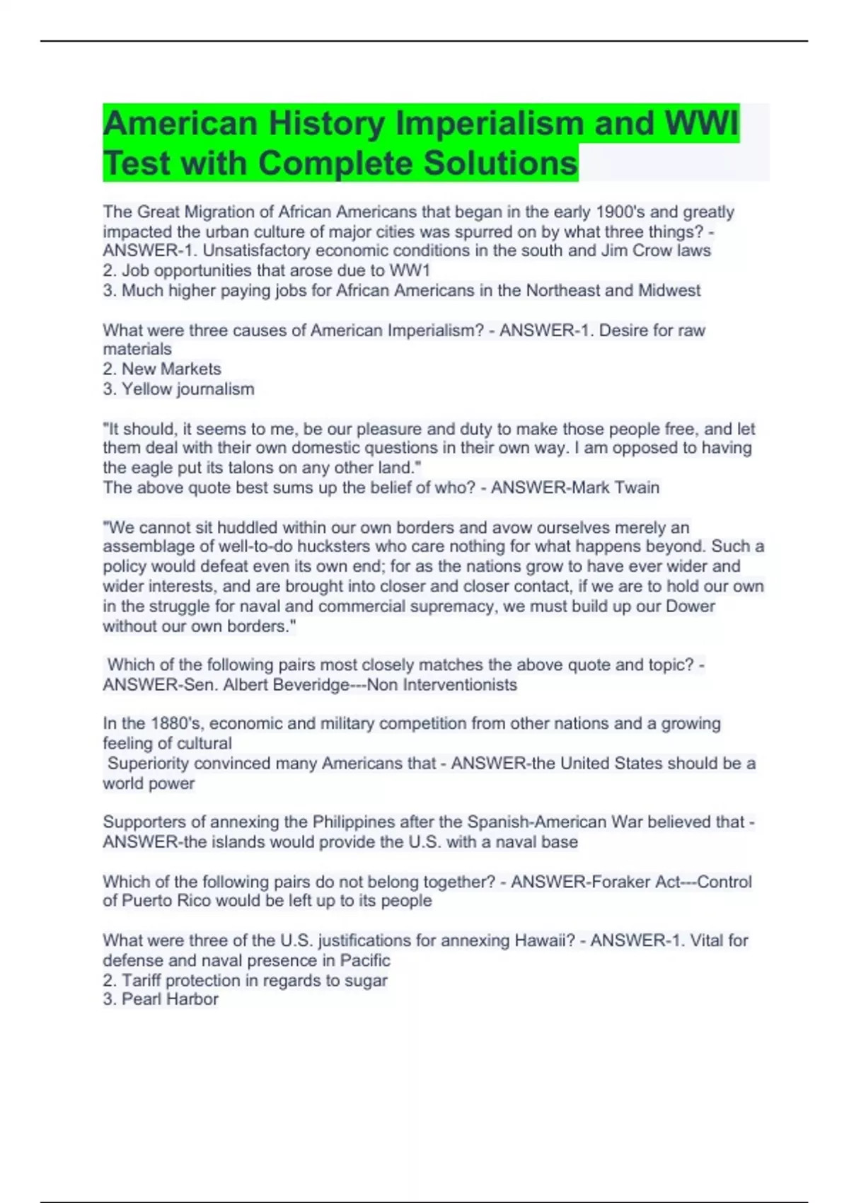 The Great Migration of African Americans that began in the early 1900's and greatly impacted the urban culture of major cities was spurred on by what three things? - ANSWER-1. Unsatisfactory economic conditions in the south and Jim Crow laws 2. Job opportunities that arose due to WW1 3. Much higher paying jobs for African Americans in the Northeast and Midwest What were three causes of American Imperialism? - ANSWER-1. Desire for raw materials 2. New Markets 3. Yellow journalism "It should, it seems to me, be our pleasure and duty to make those people free, and let them deal with their own domestic questions in their own way. I am opposed to having the eagle put its talons on any other land." The above quote best sums up the belief of who? - ANSWER-Mark Twain "We cannot sit huddled within our own borders and avow ourselves merely an assemblage of well-to-do hucksters who care nothing for what happens beyond. Such a policy would defeat even its own end; for as the nations grow to have ever wider and wider interests, and are brought into closer and closer contact, if we are to hold our own in the struggle for naval and commercial supremacy, we must build up our Dower without our own borders." Which of the following pairs most closely matches the above quote and topic? - ANSWER-Sen. Albert Beveridge---Non Interventionists In the 1880's, economic and military competition from other nations and a growing feeling of cultural Superiority convinced many Americans that - ANSWER-the United States should be a world power Supporters of annexing the Philippines after the Spanish-American War believed that - ANSWER-the islands would provide the U.S. with a naval base Which of the following pairs do not belong together? - ANSWER-Foraker Act---Control of Puerto Rico would be left up to its people What were three of the U.S. justifications for annexing Hawaii? - ANSWER-1. Vital for defense and naval presence in Pacific 2. Tariff protection in regards to sugar 3. Pearl Harbor