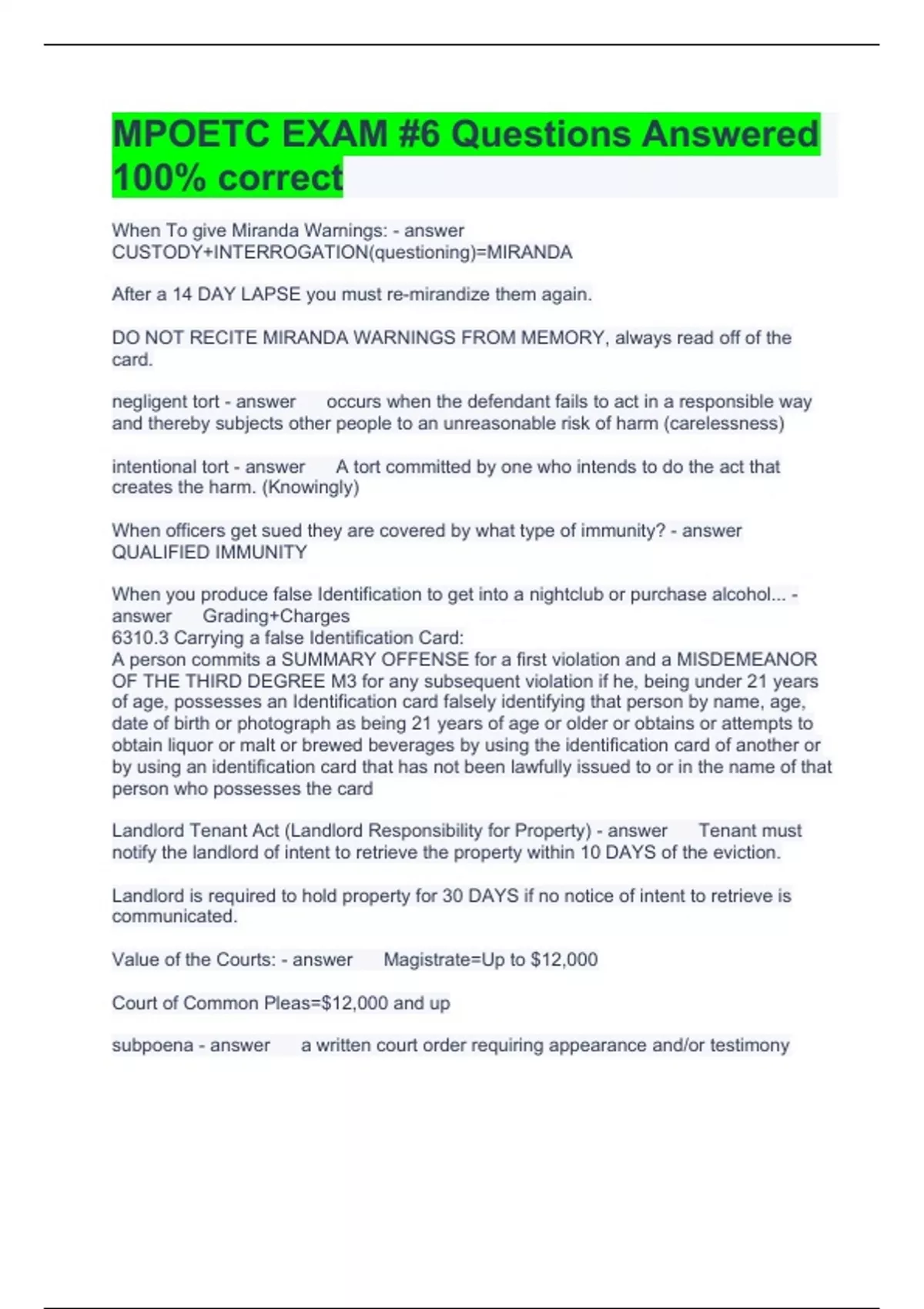 MPOETC EXAM #6 Questions Answered 100% correct When To give Miranda Warnings: CUSTODY+INTERROGATION(questioning)=MIRANDA After a 14 DAY LAPSE you must re-mirandize them again. DO NOT RECITE MIRANDA WARNINGS FROM MEMORY, always read off of the card. negligent tort occurs when the defendant fails to act in a responsible way and thereby subjects other people to an unreasonable risk of harm (carelessness) intentional tort A tort committed by one who intends to do the act that creates the harm. (Knowingly) When officers get sued they are covered by what type of immunity? QUALIFIED IMMUNITY When you produce false Identification to get into a nightclub or purchase alcohol... Grading+Charges 6310.3 Carrying a false Identification Card: A person commits a SUMMARY OFFENSE for a first violation and a MISDEMEANOR OF THE THIRD DEGREE M3 for any subsequent violation if he, being under 21 years of age, possesses an Identification card falsely identifying that person by name, age, date of birth or photograph as being 21 years of age or older or obtains or attempts to obtain liquor or malt or brewed beverages by using the identification card of another or by using an identification card that has not been lawfully issued to or in the name of that person who possesses the card Landlord Tenant Act (Landlord Responsibility for Property) Tenant must notify the landlord of intent to retrieve the property within 10 DAYS of the eviction. Landlord is required to hold property for 30 DAYS if no notice of intent to retrieve is communicated. Value of the Courts: Magistrate=Up to $12,000 Court of Common Pleas=$12,000 and up subpoena a written court order requiring appearance and/or testimony Contents of Subpoena Have person's name, address, and purpose for appearing at court on the subpoena. Also include the date, time, and place of appearance Statute of Limitation In PA The statute is 2 years, under federal law the statute will begin to run when the plaintiff knew or should have known To sustain an action the Plaintiff must prove: -The individual/entity acted under color of state law -the actions of the individual/entity deprived the plaintiff of rights, privileges, or immunities guaranteed under federal law or in the US constitution Elements of the Litigation Civil action will contain: -A notice to defend statement -the names and addresses of the parties -a statement of facts involved Appeals both the plaintiff and defendant have 30 days to appeal the magisterial district judge's decision to the court of common pleas 6308 Purchase, consumption, possessing or transportation of liquor or malt or brewed beverages A person commits a SUMMARY OFFENSE is he, being less than 21 years of age, attempts to purchase, purchases, consumes, possesses or knowingly and intentionally transports any liquor or malt or brewed beverages 6307 Misrepresentation of age to secure liquor or malt or brewed beverages SUMMARY OFFENSE