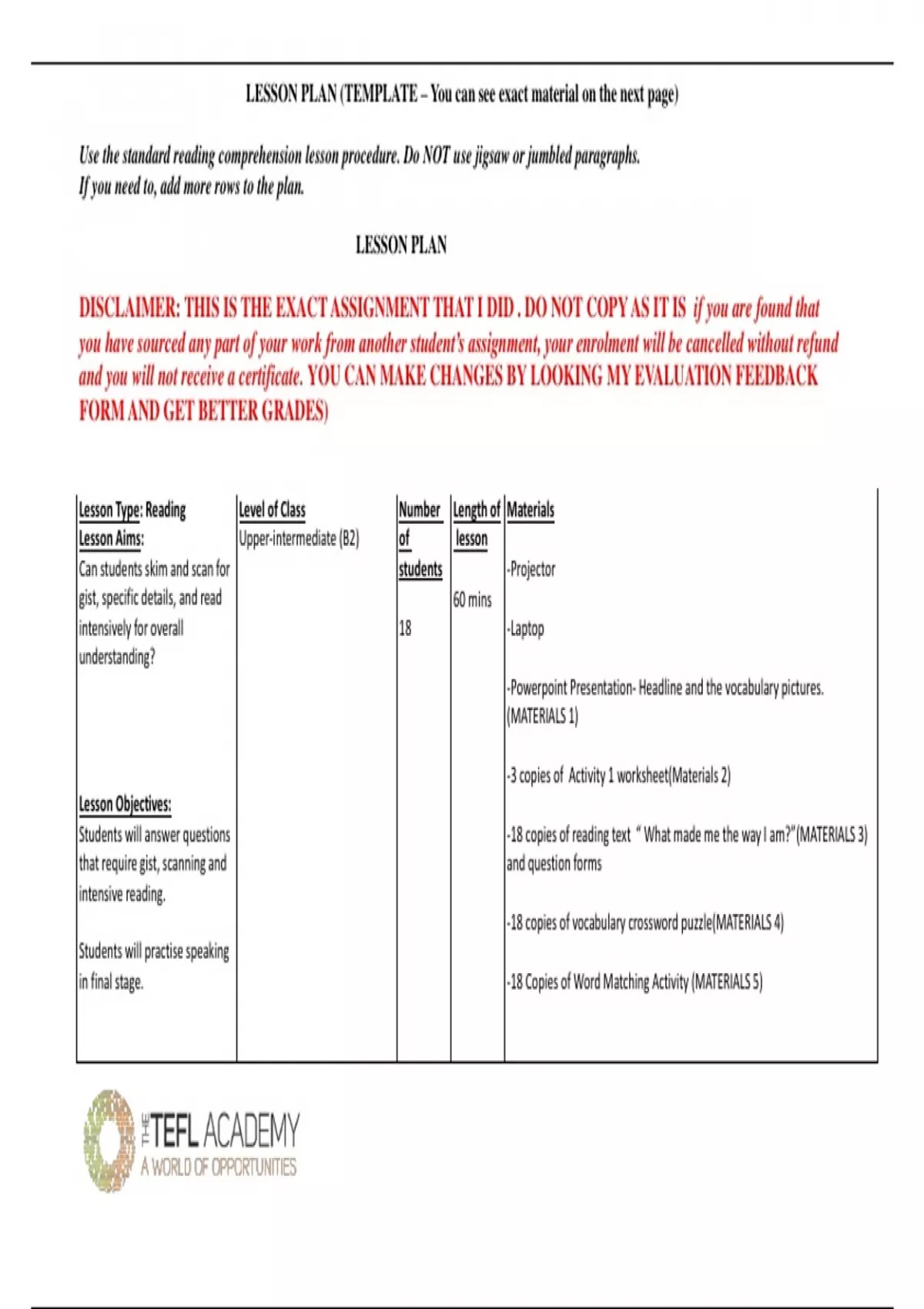 LESSON PLAN (TEMPLATE – You can see exact material on the next page)