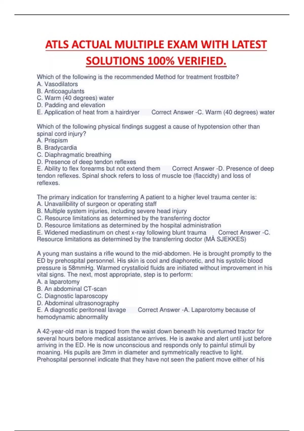 ATLS ACTUAL MULTIPLE EXAM WITH LATEST SOLUTIONS 100% VERIFIED.