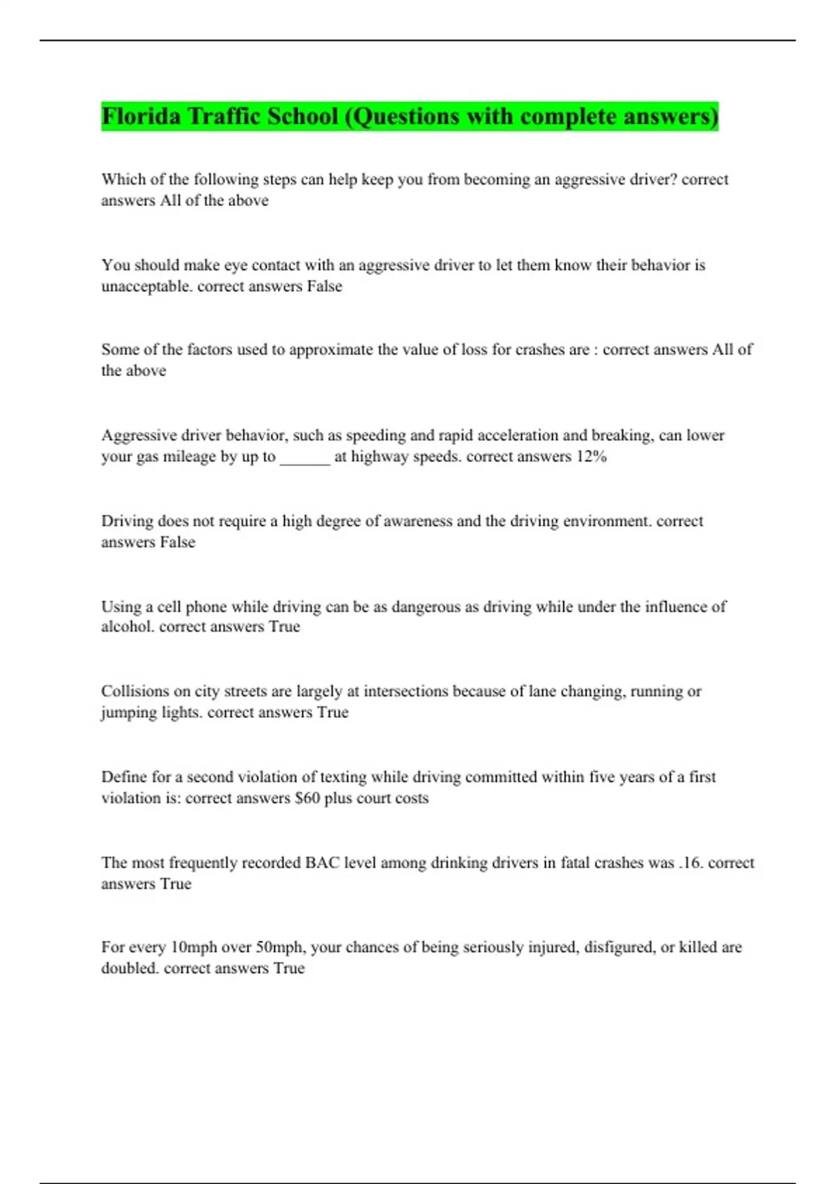 Which of the following steps can help keep you from becoming an aggressive driver? correct answers All of the above You should make eye contact with an aggressive driver to let them know their behavior is unacceptable. correct answers False Some of the factors used to approximate the value of loss for crashes are : correct answers All of the above Aggressive driver behavior, such as speeding and rapid acceleration and breaking, can lower your gas mileage by up to ______ at highway speeds. correct answers 12% Driving does not require a high degree of awareness and the driving environment. correct answers False Using a cell phone while driving can be as dangerous as driving while under the influence of alcohol. correct answers True Collisions on city streets are largely at intersections because of lane changing, running or jumping lights. correct answers True Define for a second violation of texting while driving committed within five years of a first violation is: correct answers $60 plus court costs The most frequently recorded BAC level among drinking drivers in fatal crashes was .16. correct answers True For every 10mph over 50mph, your chances of being seriously injured, disfigured, or killed are doubled. correct answers True