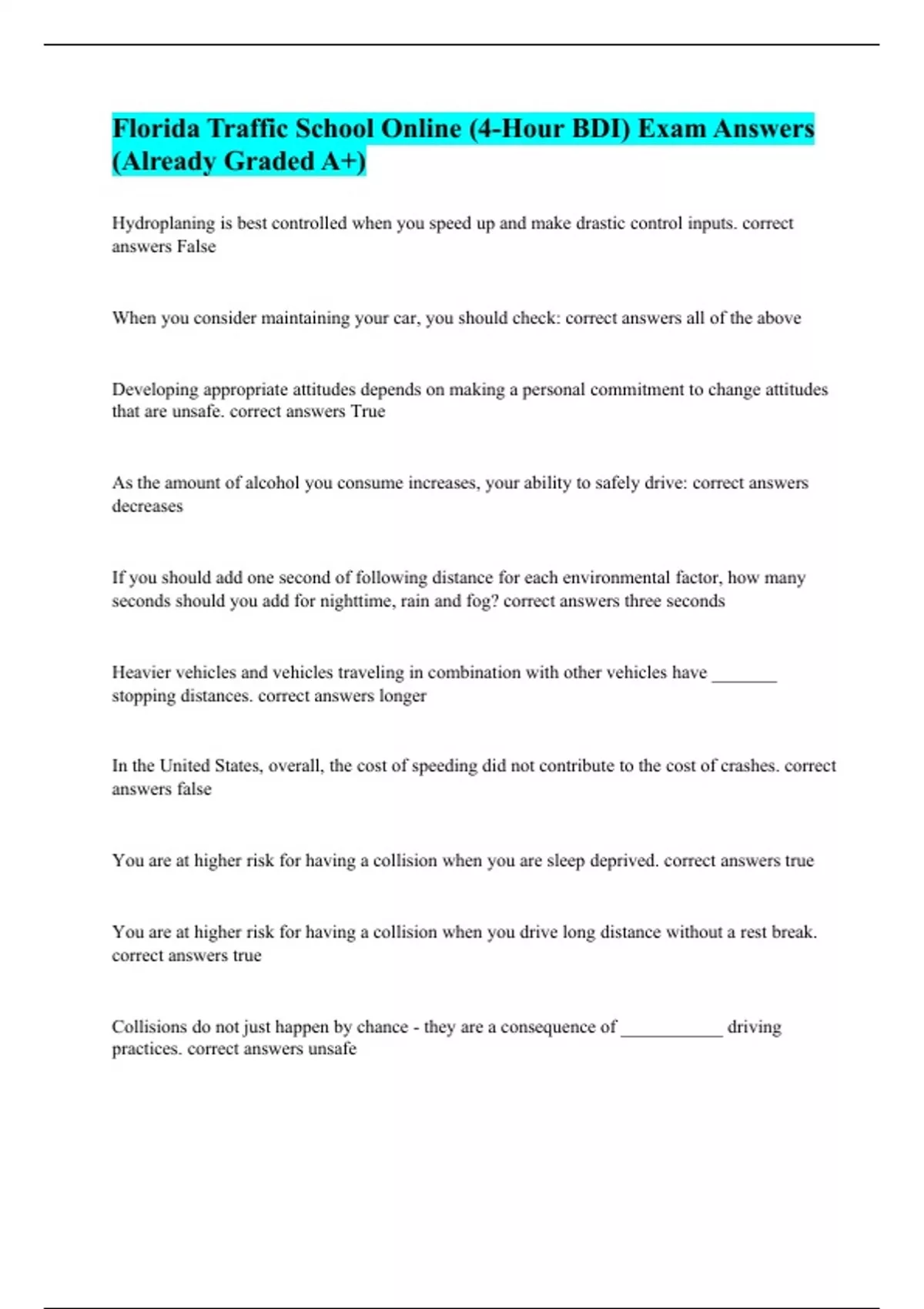 Florida Traffic School Online (4-Hour BDI) Exam Answers (Already Graded A+)
