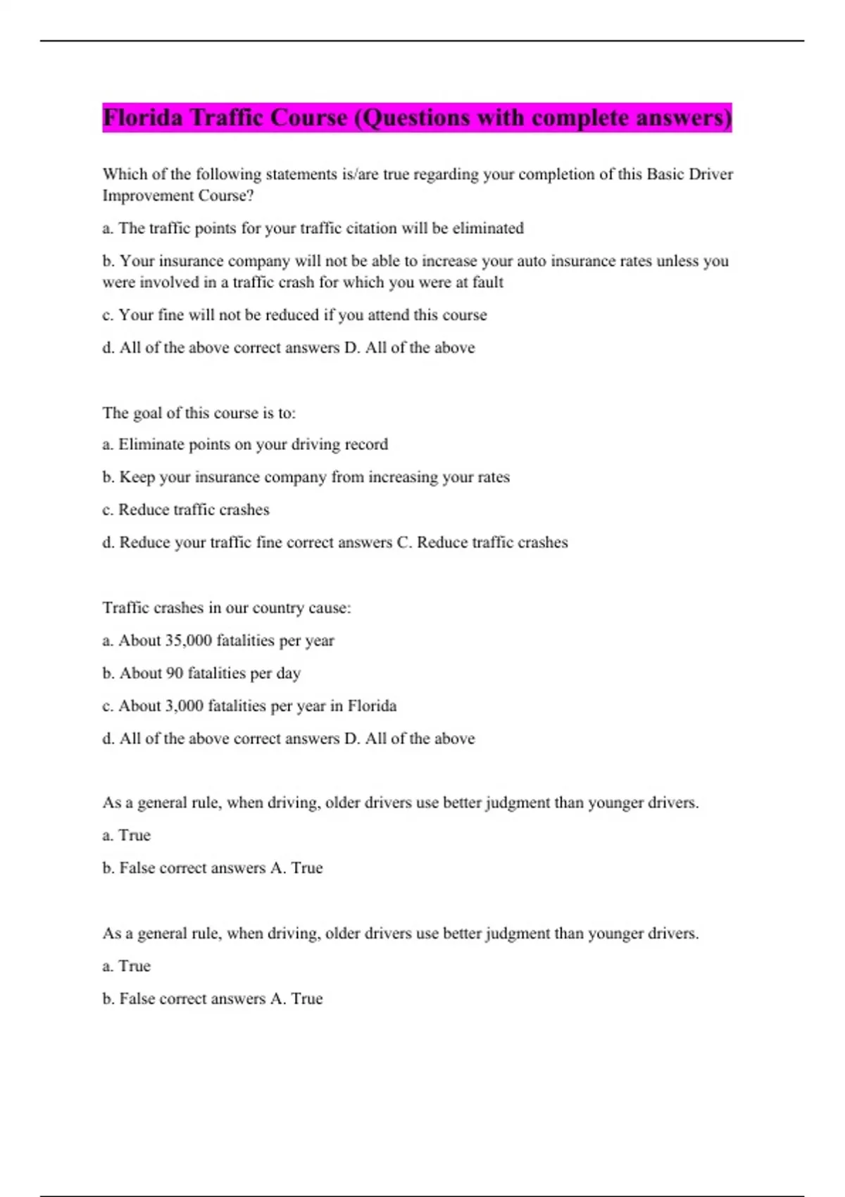 Which of the following statements is/are true regarding your completion of this Basic Driver Improvement Course? a. The traffic points for your traffic citation will be eliminated b. Your insurance company will not be able to increase your auto insurance rates unless you were involved in a traffic crash for which you were at fault c. Your fine will not be reduced if you attend this course d. All of the above correct answers D. All of the above The goal of this course is to: a. Eliminate points on your driving record b. Keep your insurance company from increasing your rates c. Reduce traffic crashes d. Reduce your traffic fine correct answers C. Reduce traffic crashes Traffic crashes in our country cause: a. About 35,000 fatalities per year b. About 90 fatalities per day c. About 3,000 fatalities per year in Florida d. All of the above correct answers D. All of the above As a general rule, when driving, older drivers use better judgment than younger drivers. a. True b. False correct answers A. True As a general rule, when driving, older drivers use better judgment than younger drivers. a. True b. False correct answers A. True