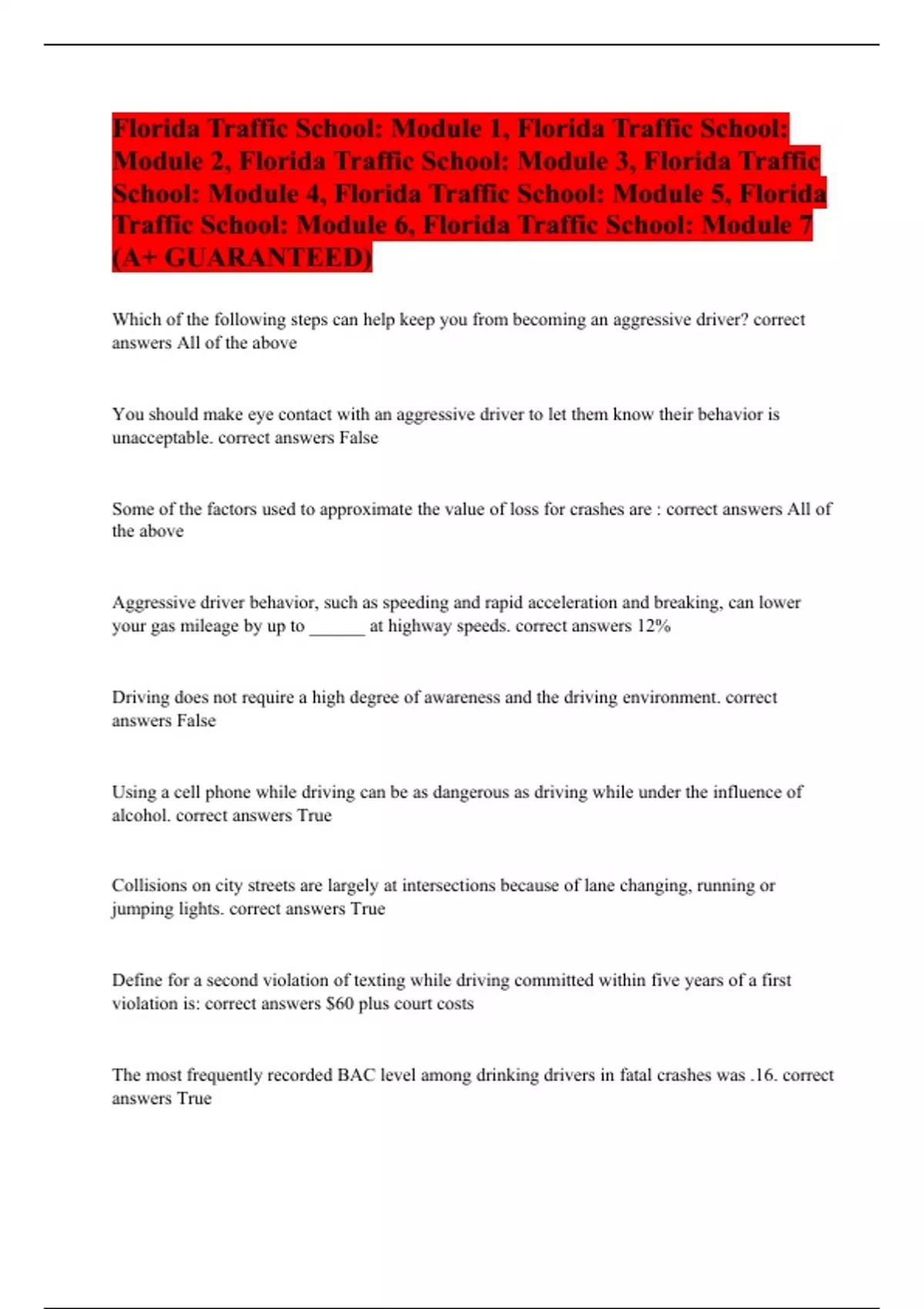 Florida Traffic School: Module 1, Florida Traffic School: Module 2, Florida Traffic School: Module 3, Florida Traffic School: Module 4, Florida Traffic School: Module 5, Florida Traffic School: Module 6, Florida Traffic School: Module 7 (A+ GUARANTEED)