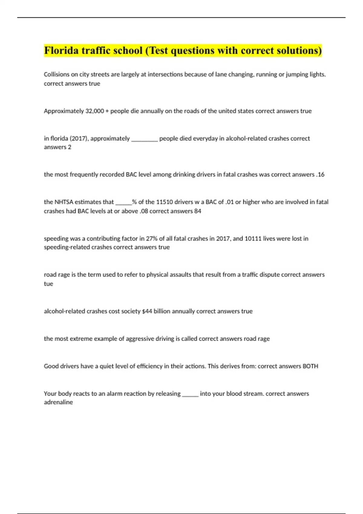 Collisions on city streets are largely at intersections because of lane changing, running or jumping lights. correct answers true Approximately 32,000 + people die annually on the roads of the united states correct answers true in florida (2017), approximately ________ people died everyday in alcohol-related crashes correct answers 2 the most frequently recorded BAC level among drinking drivers in fatal crashes was correct answers .16 the NHTSA estimates that _____% of the 11510 drivers w a BAC of .01 or higher who are involved in fatal crashes had BAC levels at or above .08 correct answers 84 speeding was a contributing factor in 27% of all fatal crashes in 2017, and 10111 lives were lost in speeding-related crashes correct answers true road rage is the term used to refer to physical assaults that result from a traffic dispute correct answers tue alcohol-related crashes cost society $44 billion annually correct answers true the most extreme example of aggressive driving is called correct answers road rage Collisions on city streets are largely at intersections because of lane changing, running or jumping lights. correct answers true Approximately 32,000 + people die annually on the roads of the united states correct answers true in florida (2017), approximately ________ people died everyday in alcohol-related crashes correct answers 2 the most frequently recorded BAC level among drinking drivers in fatal crashes was correct answers .16 the NHTSA estimates that _____% of the 11510 drivers w a BAC of .01 or higher who are involved in fatal crashes had BAC levels at or above .08 correct answers 84 speeding was a contributing factor in 27% of all fatal crashes in 2017, and 10111 lives were lost in speeding-related crashes correct answers true road rage is the term used to refer to physical assaults that result from a traffic dispute correct answers tue alcohol-related crashes cost society $44 billion annually correct answers true the most extreme example of aggressive driving is called correct answers road rage Good drivers have a quiet level of efficiency in their actions. This derives from: correct answers BOTH Your body reacts to an alarm reaction by releasing _____ into your blood stream. correct answers adrenaline Your body reacts to an alarm reaction by releasing _____ into your blood stream. correct answers adrenaline
