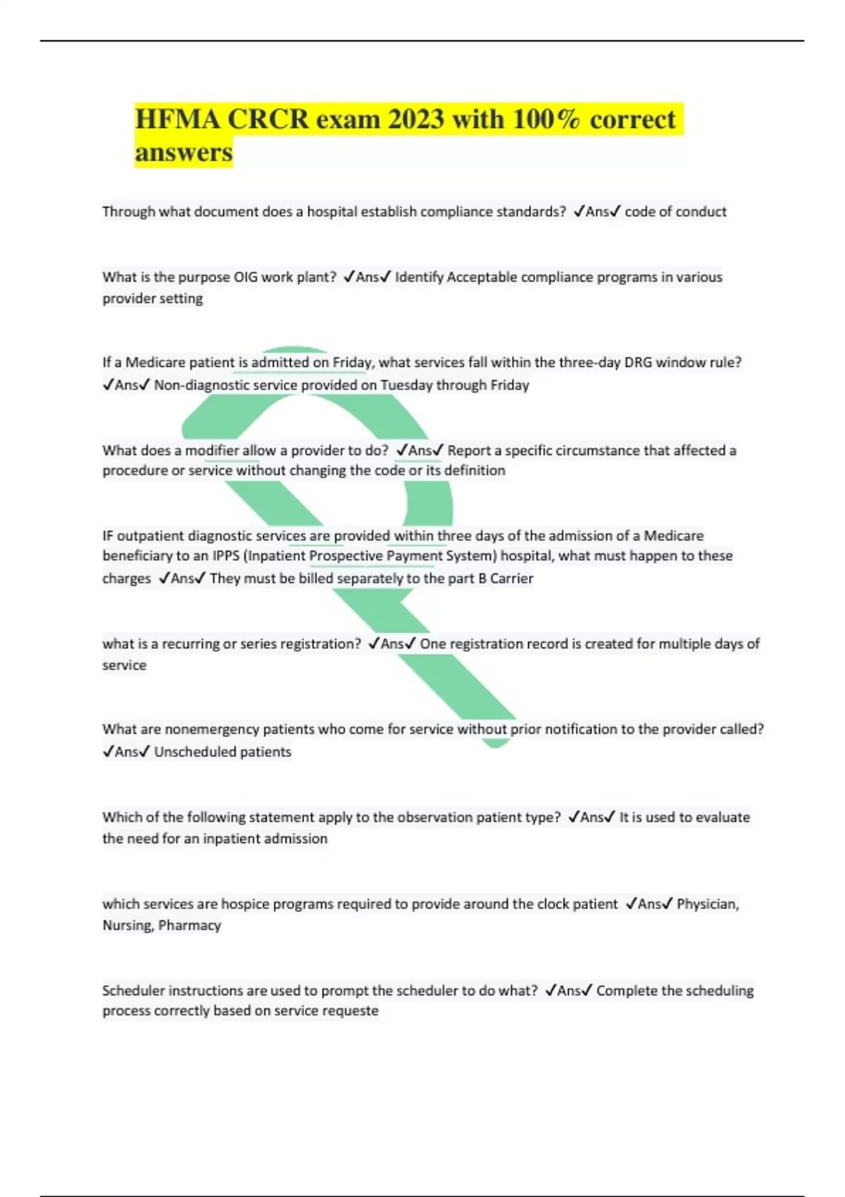 HFMA CRCR exam 2023 with 100% correct answers