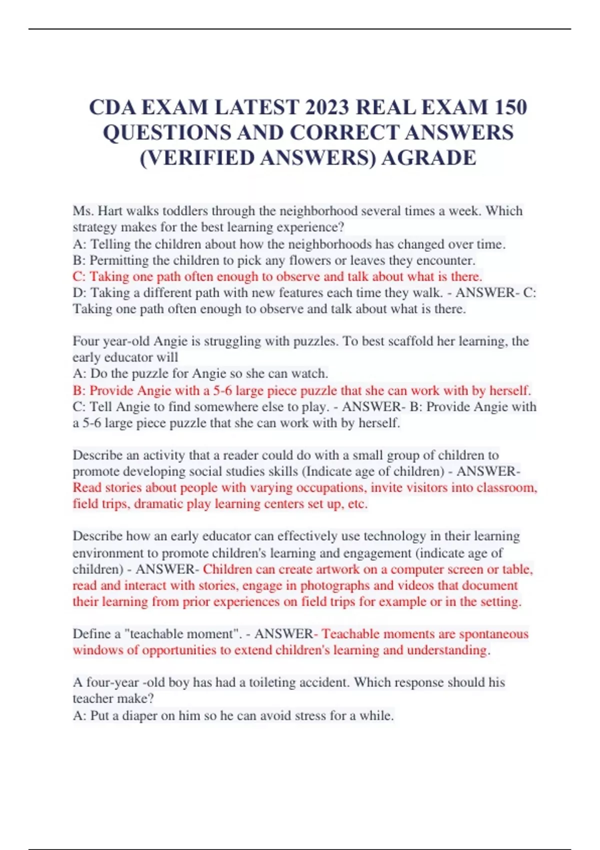 Ms. Hart walks toddlers through the neighborhood several times a week. Which strategy makes for the best learning experience? A: Telling the children about how the neighborhoods has changed over time. B: Permitting the children to pick any flowers or leaves they encounter. C: Taking one path often enough to observe and talk about what is there. D: Taking a different path with new features each time they walk. - ANSWER- C: Taking one path often enough to observe and talk about what is there. Four year-old Angie is struggling with puzzles. To best scaffold her learning, the early educator will A: Do the puzzle for Angie so she can watch. B: Provide Angie with a 5-6 large piece puzzle that she can work with by herself. C: Tell Angie to find somewhere else to play. - ANSWER- B: Provide Angie with a 5-6 large piece puzzle that she can work with by herself. Describe an activity that a reader could do with a small group of children to promote developing social studies skills (Indicate age of children) - ANSWERRead stories about people with varying occupations, invite visitors into classroom, field trips, dramatic play learning centers set up, etc. Describe how an early educator can effectively use technology in their learning environment to promote children's learning and engagement (indicate age of children) - ANSWER- Children can create artwork on a computer screen or table, read and interact with stories, engage in photographs and videos that document their learning from prior experiences on field trips for example or in the setting. Define a "teachable moment". - ANSWER- Teachable moments are spontaneous windows of opportunities to extend children's learning and understanding. A four-year -old boy has had a toileting accident. Which response should his teacher make? A: Put a diaper on him so he can avoid stress for a while.