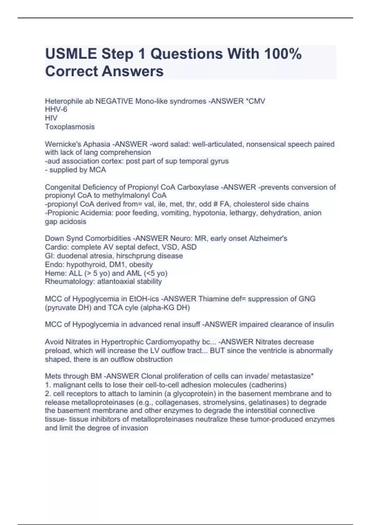 USMLE Step 1 Questions With 100% Correct Answers USMLE Step 1 Questions With 100% Correct Answers USMLE Step 1 Questions With 100% Correct Answers USMLE Step 1 Questions With 100% Correct Answers Heterophile ab NEGATIVE Mono-like syndromes -ANSWER *CMV HHV-6 HIV Toxoplasmosis Wernicke's Aphasia -ANSWER -word salad: well-articulated, nonsensical speech paired with lack of lang comprehension -aud association cortex: post part of sup temporal gyrus - supplied by MCA Congenital Deficiency of Propionyl CoA Carboxylase -ANSWER -prevents conversion of propionyl CoA to methylmalonyl CoA -propionyl CoA derived from= val, ile, met, thr, odd # FA, cholesterol side chains -Propionic Acidemia: poor feeding, vomiting, hypotonia, lethargy, dehydration, anion gap acidosis Down Synd Comorbidities -ANSWER Neuro: MR, early onset Alzheimer's Cardio: complete AV septal defect, VSD, ASD GI: duodenal atresia, hirschprung disease Endo: hypothyroid, DM1, obesity Heme: ALL ( 5 yo) and AML (5 yo) Rheumatology: atlantoaxial stability MCC of Hypoglycemia in EtOH-ics -ANSWER Thiamine def= suppression of GNG (pyruvate DH) and TCA cyle (alpha-KG DH) MCC of Hypoglycemia in advanced renal insuff -ANSWER impaired clearance of insulin Avoid Nitrates in Hypertrophic Cardiomyopathy bc... -ANSWER Nitrates decrease preload, which will increase the LV outflow tract... BUT since the ventricle is abnormally shaped, there is an outflow obstruction Mets through BM -ANSWER Clonal proliferation of cells can invade/ metastasize* 1. malignant cells to lose their cell-to-cell adhesion molecules (cadherins) 2. cell receptors to attach to laminin (a glycoprotein) in the basement membrane and to release metalloproteinases (e.g., collagenases, stromelysins, gelatinases) to degrade the basement membrane and other enzymes to degrade the interstitial connective tissue- tissue inhibitors of metalloproteinases neutralize these tumor-produced enzymes and limit the degree of invasion
