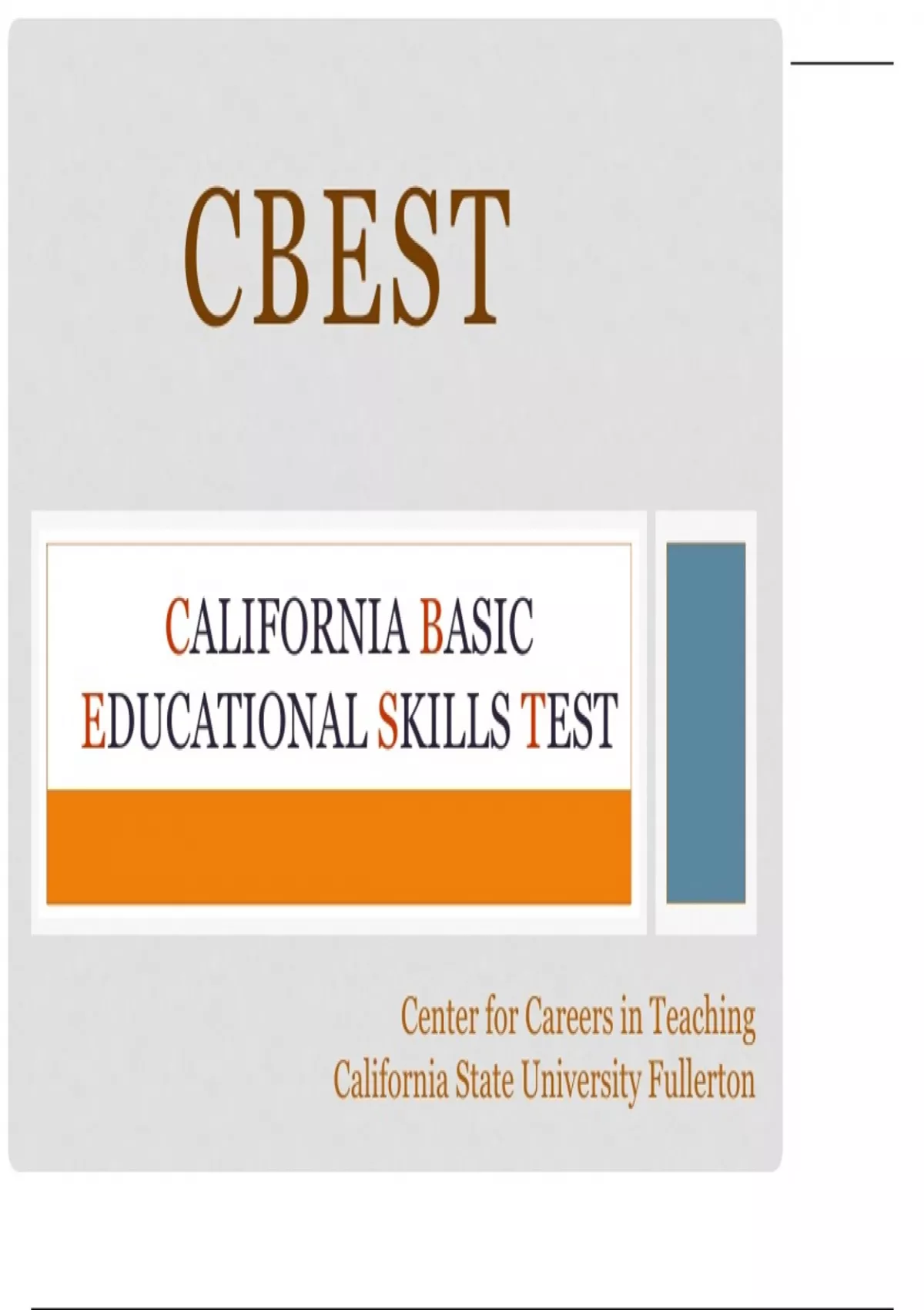 WHAT IS THE CBEST? The California Basic Educational Skills Test, or CBEST, is a four-hour exam divided into three different sections – a multiple choice Reading section, a multiple choice Mathematics section, and a Writing section with two essays. WHO MUST TAKE THE CBEST? In California, you must take the CBEST if : • You are applying for a CTC approved teacher preparation/credential program • You are applying to be a day to day substitute • You are applying for a first teaching credential MEET THE BASIC SKILL REQUIREMENT Examination English Score Requirement Math Score Requirement CSET: Multiple Subject + CSET Writing Skills Score of 220+ CSU Early Assessment Program (EAP) “College Ready” or “Exempt” “College Ready” or “Exempt” CSU Placement Exams (EPT and ELM) Score of 151+ Score of 50+ College Board SAT Score of 500+ Score of 550+ ACT Score of 22+ Score of 23+ College Board Advanced Placement Examinations (AP) Score of 3 or above on one of the following: • AP English Language and Composition • AP English Literature and Composition Score of 3 or above on one of the following: • AP Calculus AB • AP Calculus BC • AP Statistics WHEN IS THE CBEST OFFERED? • Paper-based testing ($41)is offered five to six times during the year. In , you can take the CBEST in the following months: September, December, February, April, and July. • Computer- based testing ($41+ $61)is available year-round by appointment only, Monday through Saturday (excluding holidays). PAPER-BASED TESTING Downloaded from TAKING AND PASSING THE TEST • You must pass all three sections: Reading, Mathematics, and Writing. • Once you pass a particular section, you do not have to take that section again. • If you do not pass a section, you can register, pay the $41 fee and retake the entire test or just that one section. Note that you may not take the CBEST more than once in any 45– calendar-day period. • Retaking sections that you have already passed may help you reach th