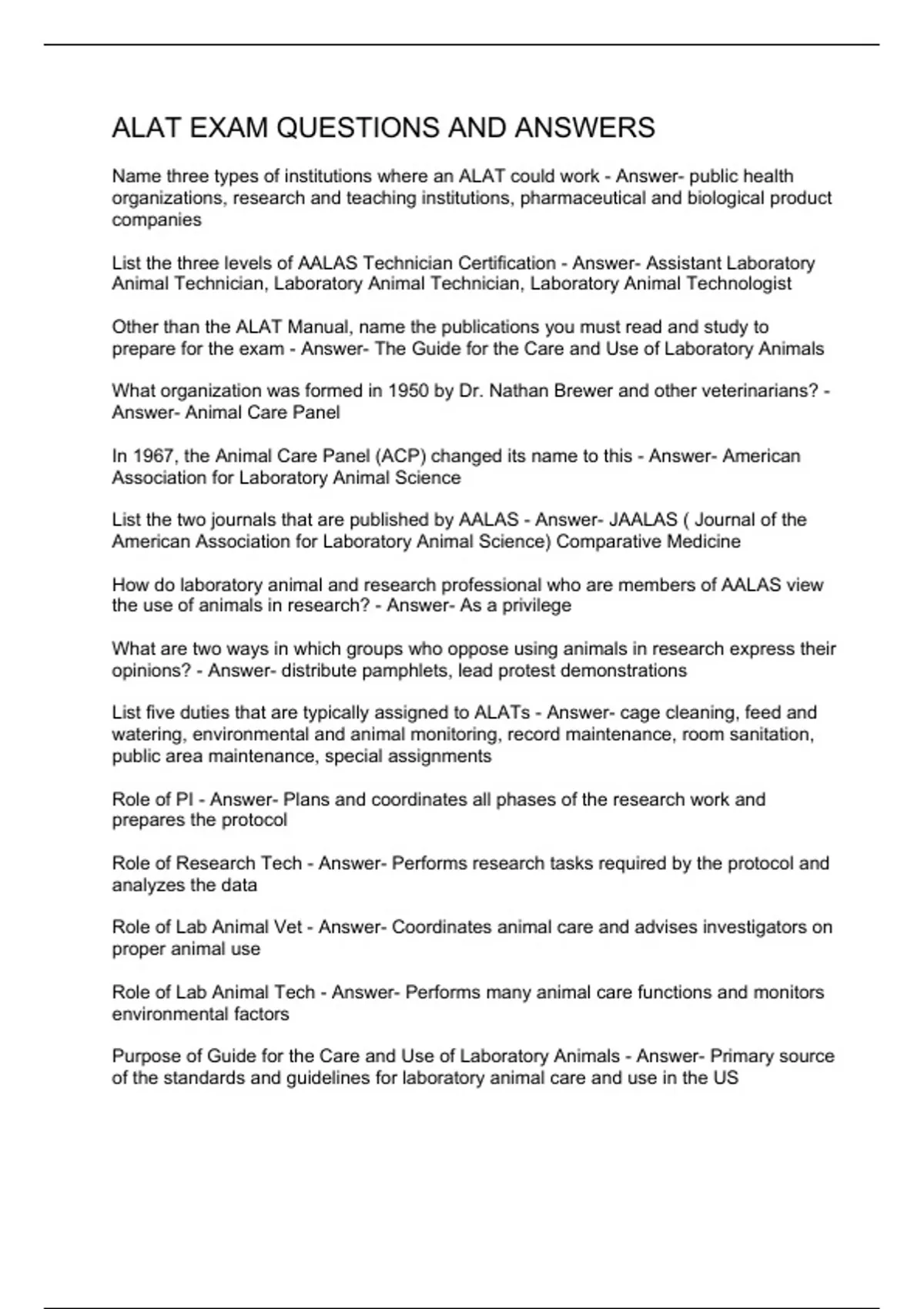 Name three types of institutions where an ALAT could work - Answer- public health organizations, research and teaching institutions, pharmaceutical and biological product companies List the three levels of AALAS Technician Certification - Answer- Assistant Laboratory Animal Technician, Laboratory Animal Technician, Laboratory Animal Technologist Other than the ALAT Manual, name the publications you must read and study to prepare for the exam - Answer- The Guide for the Care and Use of Laboratory Animals What organization was formed in 1950 by Dr. Nathan Brewer and other veterinarians? - Answer- Animal Care Panel In 1967, the Animal Care Panel (ACP) changed its name to this - Answer- American Association for Laboratory Animal Science List the two journals that are published by AALAS - Answer- JAALAS ( Journal of the American Association for Laboratory Animal Science) Comparative Medicine How do laboratory animal and research professional who are members of AALAS view the use of animals in research? - Answer- As a privilege What are two ways in which groups who oppose using animals in research express their opinions? - Answer- distribute pamphlets, lead protest demonstrations List five duties that are typically assigned to ALATs - Answer- cage cleaning, feed and watering, environmental and animal monitoring, record maintenance, room sanitation, public area maintenance, special assignments Role of PI - Answer- Plans and coordinates all phases of the research work and prepares the protocol Role of Research Tech - Answer- Performs research tasks required by the protocol and analyzes the data Role of Lab Animal Vet - Answer- Coordinates animal care and advises investigators on proper animal use Role of Lab Animal Tech - Answer- Performs many animal care functions and monitors environmental factors Purpose of Gu