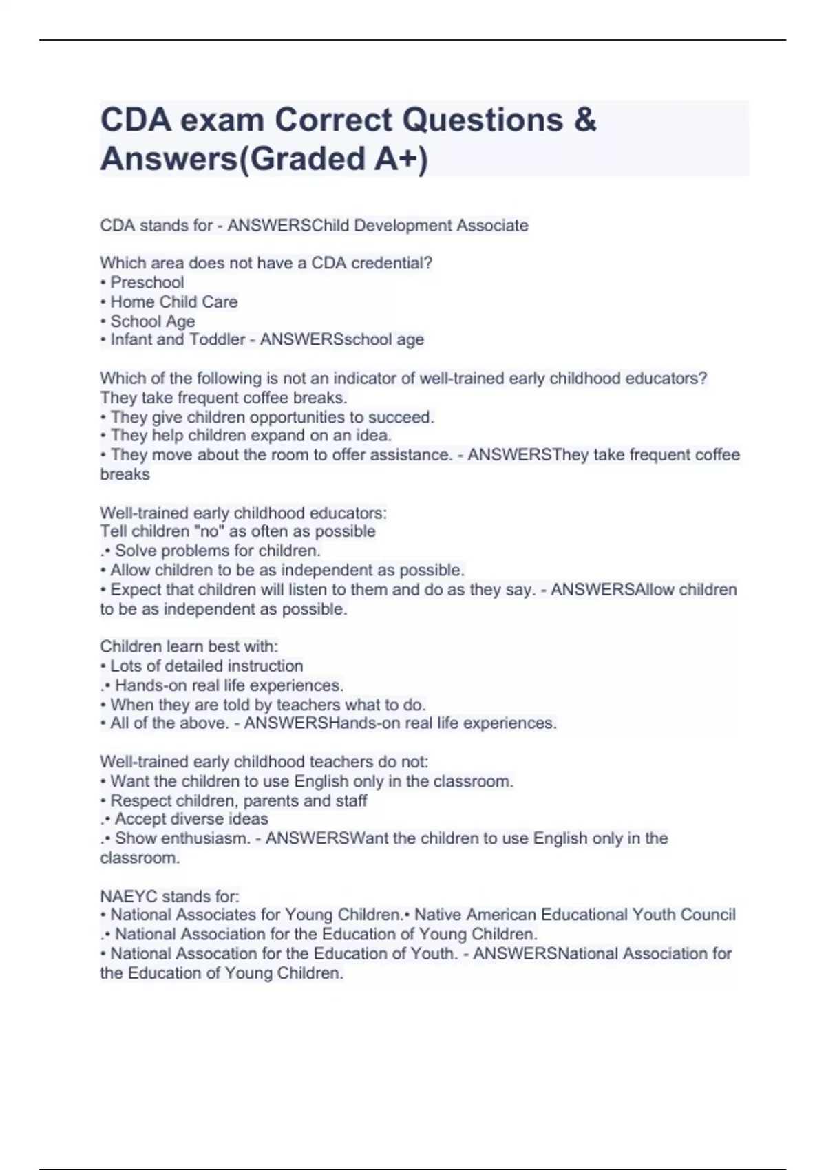 CDA stands for - ANSWERSChild Development Associate Which area does not have a CDA credential? • Preschool • Home Child Care • School Age • Infant and Toddler - ANSWERSschool age Which of the following is not an indicator of well-trained early childhood educators? They take frequent coffee breaks. • They give children opportunities to succeed. • They help children expand on an idea. • They move about the room to offer assistance. - ANSWERSThey take frequent coffee breaks Well-trained early childhood educators: Tell children "no" as often as possible .• Solve problems for children. • Allow children to be as independent as possible. • Expect that children will listen to them and do as they say. - ANSWERSAllow children to be as independent as possible. Children learn best with: • Lots of detailed instruction .• Hands-on real life experiences. • When they are told by teachers what to do. • All of the above. - ANSWERSHands-on real life experiences. Well-trained early childhood teachers do not: • Want the children to use English only in the classroom. • Respect children, parents and staff .• Accept diverse ideas .• Show enthusiasm. - ANSWERSWant the children to use English only in the classroom. NAEYC stands for: • National Associates for Young Children.• Native American Educational Youth Council .• National Association for the Education of Young Children. • National Assocation for the Education of Youth. - ANS