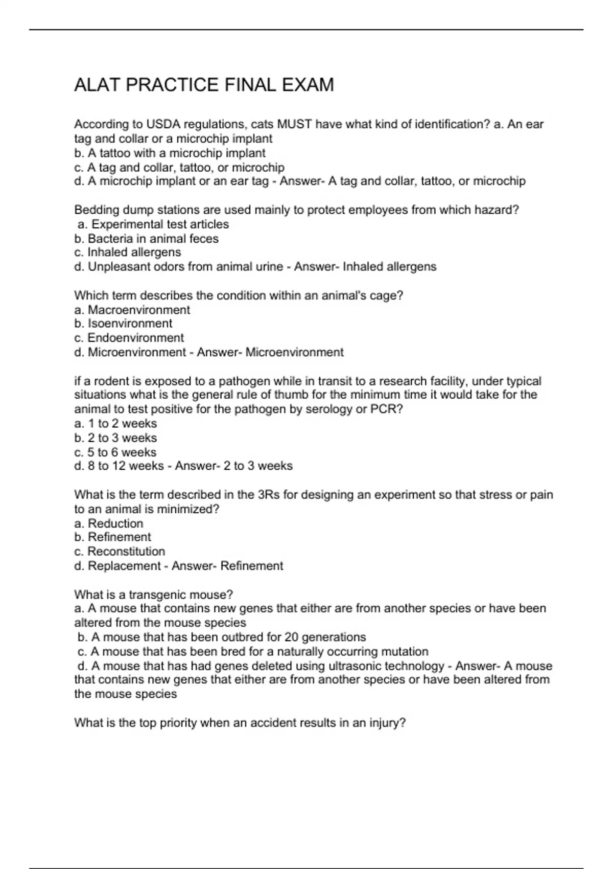 According to USDA regulations, cats MUST have what kind of identification? a. An ear tag and collar or a microchip implant b. A tattoo with a microchip implant c. A tag and collar, tattoo, or microchip d. A microchip implant or an ear tag - Answer- A tag and collar, tattoo, or microchip Bedding dump stations are used mainly to protect employees from which hazard? a. Experimental test articles b. Bacteria in animal feces c. Inhaled allergens d. Unpleasant odors from animal urine - Answer- Inhaled allergens Which term describes the condition within an animal's cage? a. Macroenvironment b. Isoenvironment c. Endoenvironment d. Microenvironment - Answer- Microenvironment if a rodent is exposed to a pathogen while in transit to a research facility, under typical situations what is the general rule of thumb for the minimum time it would take for the animal to test positive for the pathogen by serology or PCR? a. 1 to 2 weeks b. 2 to 3 weeks c. 5 to 6 weeks d. 8 to 12 weeks - Answer- 2 to 3 weeks What is the term described in the 3Rs for designing an experiment so that stress or pain to an animal is minimized? a. Reduction b. Refinement c. Reconstitution d. Replacement - Answer- Refinement What is a transgenic mouse? a. A mouse that contains new genes that either are from another species or have been altered from the mouse species b. A mouse that has been outbred for 20 generations c. A mouse that has been bred for a naturally occurring mutation d. A mouse that has had genes deleted using ultrasonic technology - Answer- A mouse that contains new genes that either are from another species or have been altered from the mouse species Wha