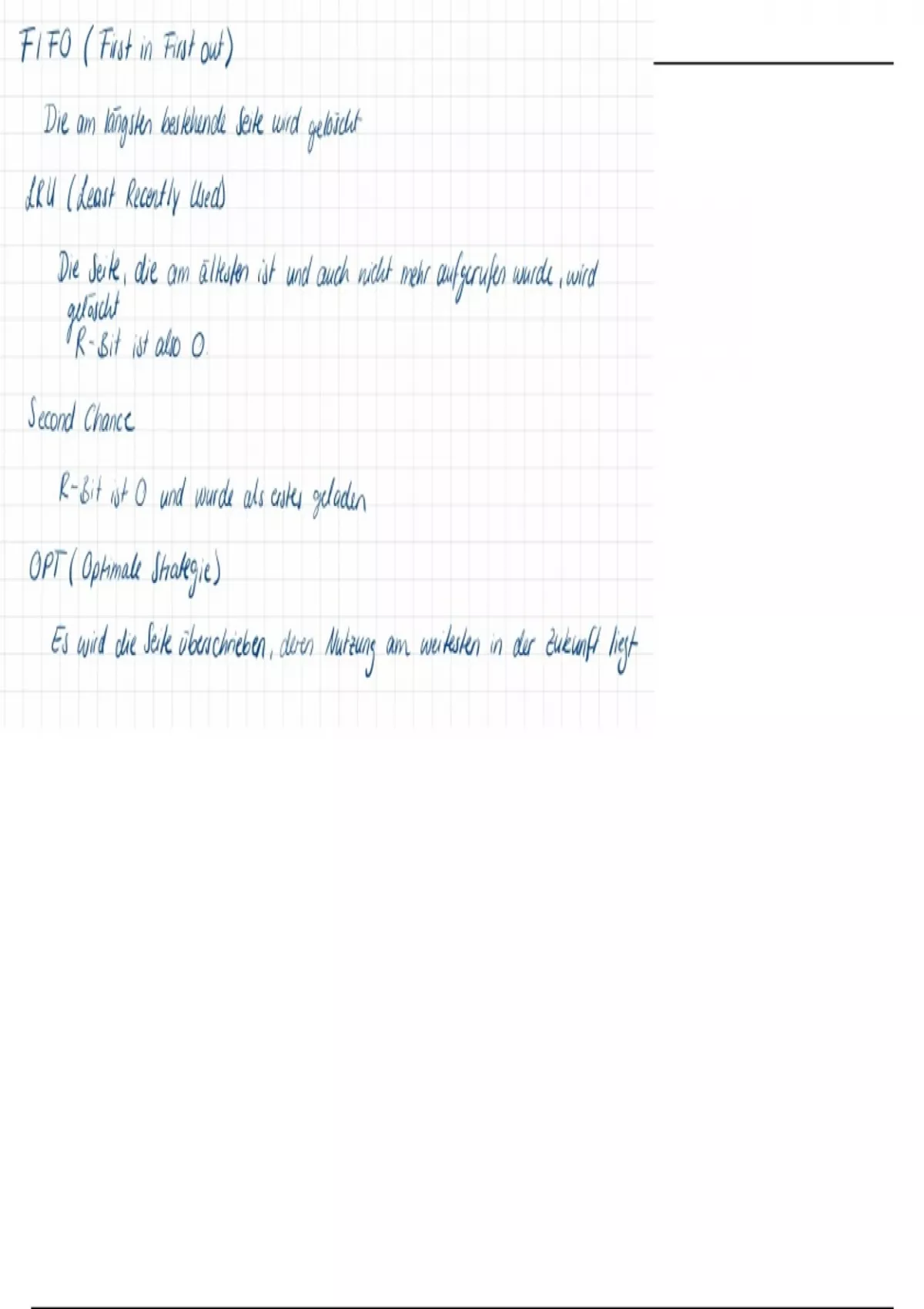 Eine Zusammenfassung zu Seitenfehler und ihre Algorithmen. Beschreibung und Beispiele von FIFO (First In First out), LRU (Least Recently Used), Second Chance und OPT (Optimale Strategie)