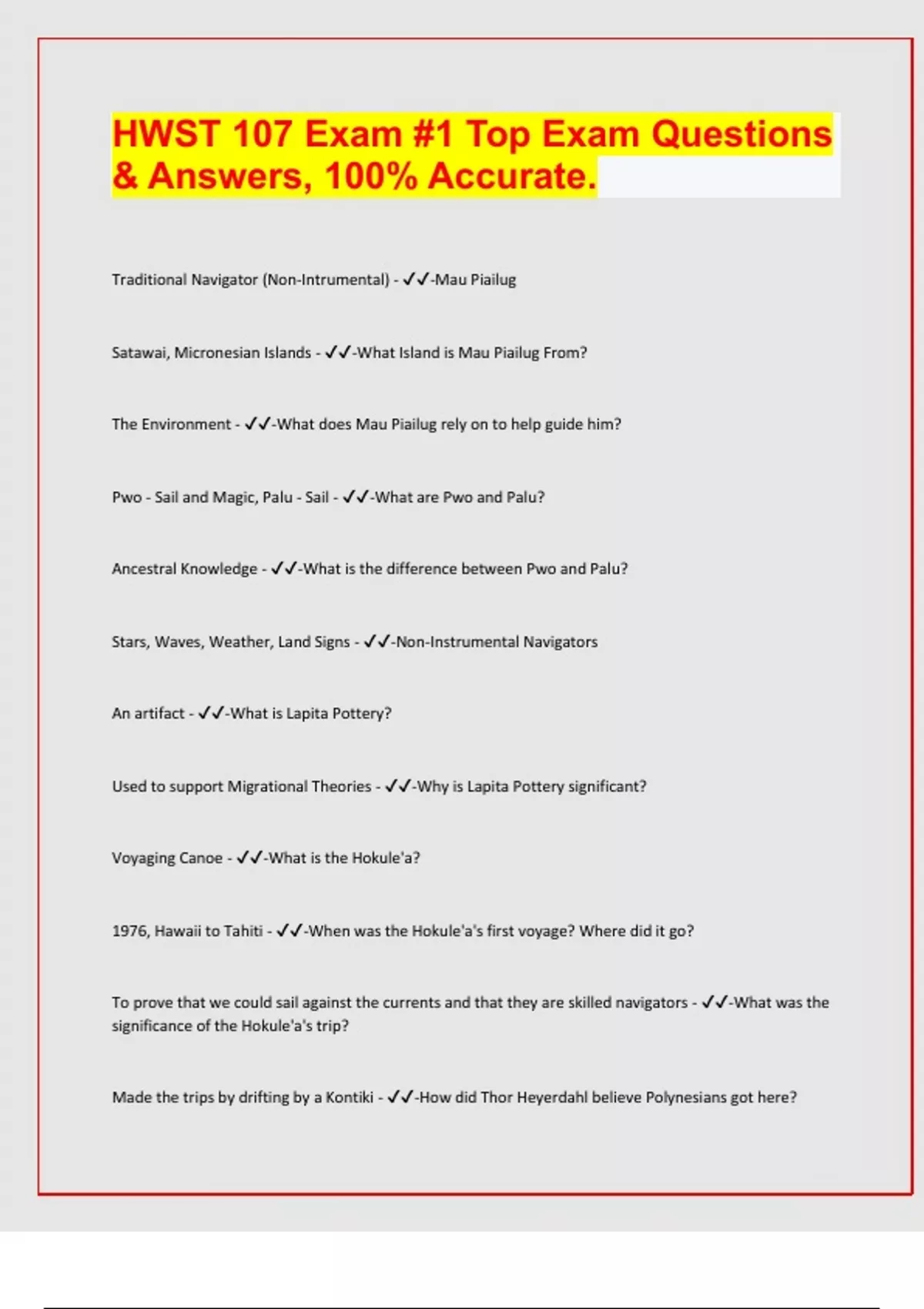 HWST 107 Exam #1 Top Exam Questions & Answers, 100% Accurate. Traditional Navigator (Non-Intrumental) - -Mau Piailug Satawai, Micronesian Islands - -What Island is Mau Piailug From? The Environment - -What does Mau Piailug rely on to help guide him? Pwo - Sail and Magic, Palu - Sail - -What are Pwo and Palu? Ancestral Knowledge - -What is the difference between Pwo and Palu? Stars, Waves, Weather, Land Signs - -Non-Instrumental Navigators An artifact - -What is Lapita Pottery? Used to support Migrational Theories - -Why is Lapita Pottery significant? Voyaging Canoe - -What is the Hokule'a? 1976, Hawaii to Tahiti - -When was the Hokule'a's first voyage? Where did it go? To prove that we could sail against the currents and that they are skilled navigators - -What was the significance of the Hokule'a's trip? Made the trips by drifting by a Kontiki - -How did Thor Heyerdahl believe Polynesians got here?