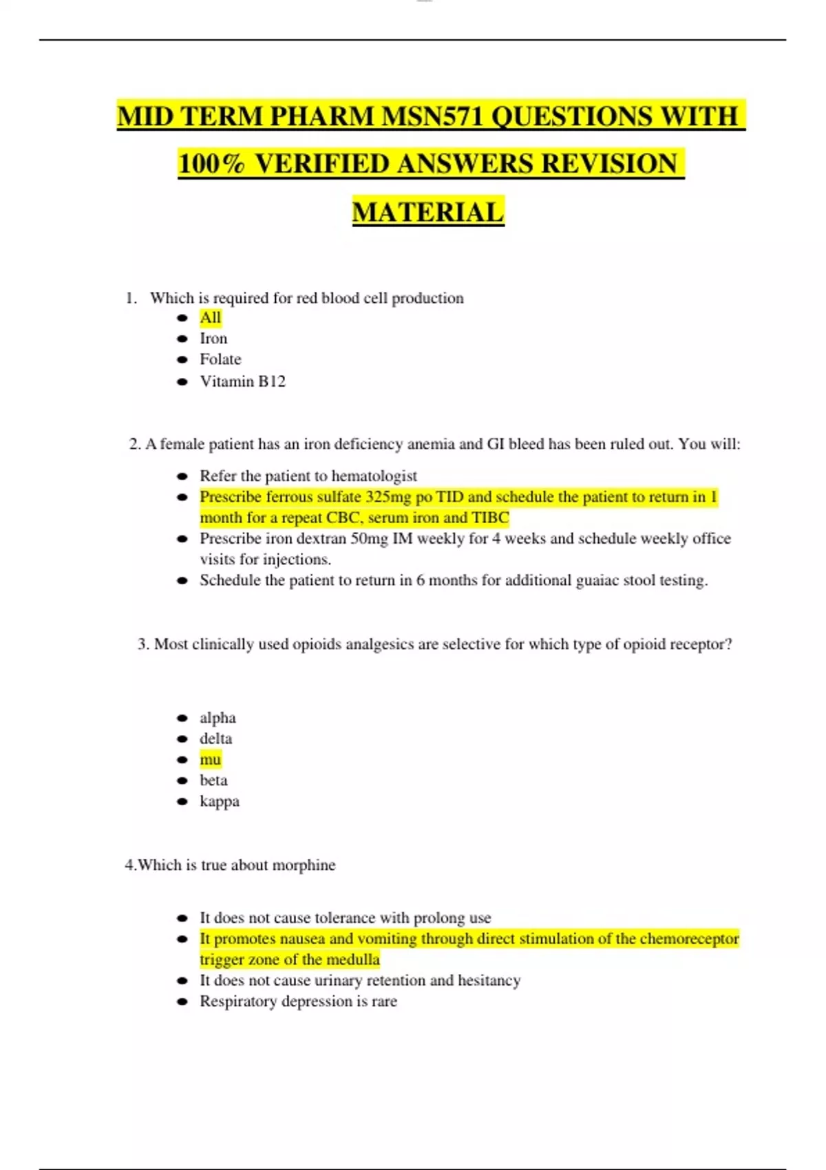MID TERM PHARM MSN571 QUESTIONS WITH 100% VERIFIED ANSWERS REVISION MATERIAL
