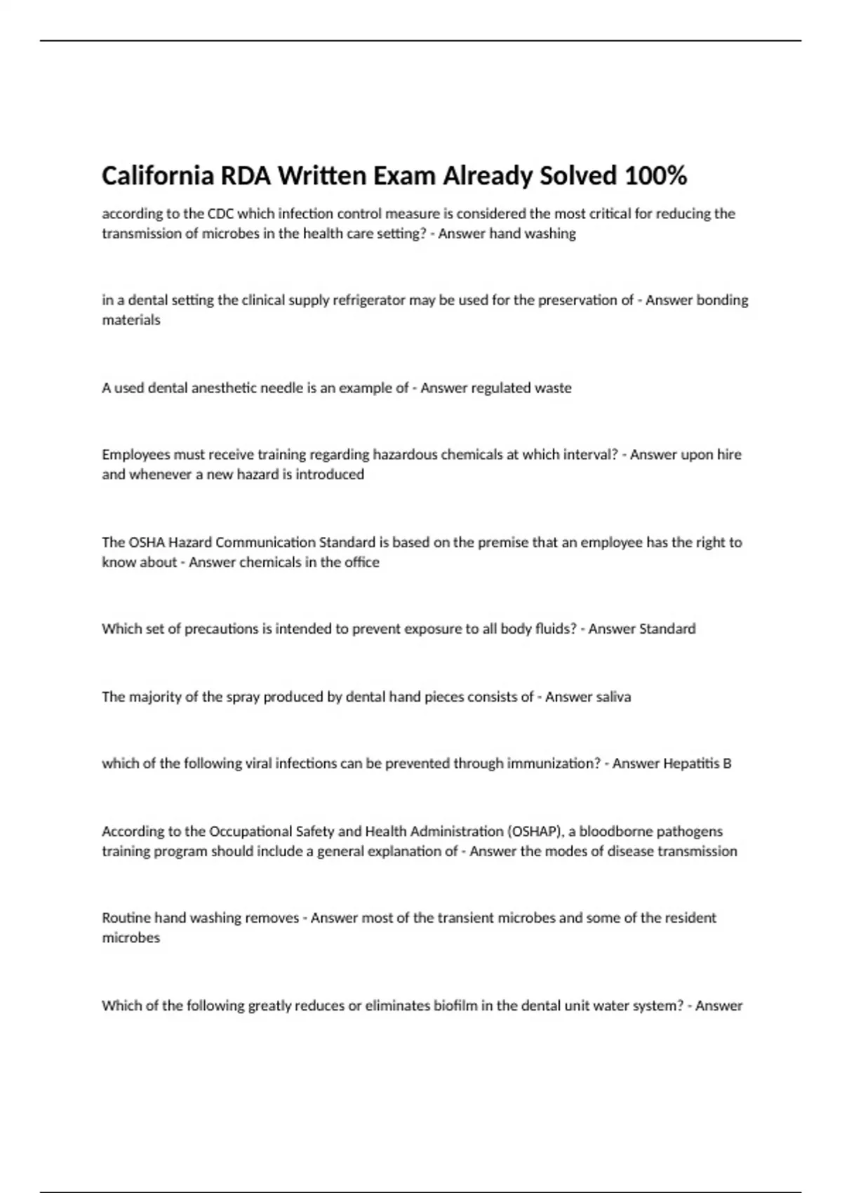 according to the CDC which infection control measure is considered the most critical for reducing the transmission of microbes in the health care setting? - Answer hand washing in a dental setting the clinical supply refrigerator may be used for the preservation of - Answer bonding materials A used dental anesthetic needle is an example of - Answer regulated waste Employees must receive training regarding hazardous chemicals at which interval? - Answer upon hire and whenever a new hazard is introduced The OSHA Hazard Communication Standard is based on the premise that an employee has the right to know about - Answer chemicals in the office Which set of precautions is intended to prevent exposure to all body fluids? - Answer Standard The majority of the spray produced by dental hand pieces consists of - Answer saliva which of the following viral infections can be prevented through immunization? - Answer Hepatitis B According to the Occupational Safety and Health Administration (OSHAP), a bloodborne pathogens training program should include a general explanation of - Answer the modes of disease transmission Routine hand washing removes - Answer most of the transient microbes and some of the resident microbes Which of the following greatly reduces or eliminates biofilm in the dental unit water system? - Answer properly using chemical treatments which of the following modes of disease transmission best describes a human bite? - Answer parenteral the primary reason a surgical face mask must be used during a dental procedure is to - Answer protect the DHCP from exposure to spatter Instrument cassettes should be wrapped - Answer after cleaning and before sterilization Used radiograph fixer solution is usually considered - Answer hazardous waste Which party is responsible for ensuring a Material Safety Data Sheet is available in the work place for each hazardous material? - Answer Employer Which of the following statements most accurately defines engineering controls? - Answer Materials and devices that prevent employees exposure to hazardous or infectious substances When using the air water syringe during dental treatment which of the following personal protective equipment are recommended by the CDC? - Answer gloves, mask, gown, and eye protection According to the Center for Disease Control and Prevention, patient-care items that penetrate soft tissue are categorized as - Answer critical The purpose of a holding solution is to - Answer prevent hardening of debris and body fluids on instruments Which barrier should be removed before temporarily leaving a patient to retrieve supplies? - Answer gloves The majority of organisms that make up dental unit waterline biofilm consists of - Answer water bacteria Material Safety Data Sheet (MSDS) are required by OSHA'S - Answer Hazardous Communication Standard Besides alcohol, which of the following is a common antimicrobial agent found in hand hygiene products? - Answer Chlorohexidine The accessibility of the exposure control plan for employees is the responsibility of the - Answer employer High- level disinfectants should be used - Answer according to the manufacturer's directions Exposure of dental heathcare personnel to nitrous oxide gases can be reduced by - Answer using a scavenger system on the nitrous oxide equipment When putting on personal protective equipment, which barrier should be put on last, just before patient care begins? - Answer gloves To prepare for sterilization, the high-speed hand piece and reusable air-water syringe tip should be flushed with water - Answer after each patient Who is responsible for the evaluation of hazardous chemicals? - Answer chemicals manufacturers and importers During normal use, which of the following is the most likely hazard for a dentist using a curing light? - Answer eye exposure to the light An exposure plan must be updated - Answer annually and when new or modified tasks are introduced Wearing a punctured gloves during patient care may result in which type of microbial contact? - Answer direct Work practice controls include the use of a - Answer one-handed recapping technique Heat sterilization of extracted teeth may result in - Answer the vaporization of mercury, presenting a health hazard. A person with a latent tuberculosis infection will - Answer have a positive skin test and no symptoms of active tuberculosis Which is the minimum temperature a steam sterilizer should reach to achieve sterilization? - Answer 121 degrees C Which of the following is an example of a clinical contract surface? - Answer countertops which of the following is recommended to minimize the occupational exposure to atmospheric nitrous oxide? - Answer use a properly fitted nasal patient mask who is responsible for appropriate regulated waste disposal? - Answer the generation facility According to the OSHA Bloodborne Pathogens Standard, each dental office must have a exposure control plan that is - Answer written and reviewed at least once every year The main purpose of surgical hand antisepsis is to - Answer to reduce the chance for contamination of the patient if the glove become punctured or torn. According to the OSHA Bloodborne Pathogens Standard, a contaminated sharps container should be - Answer puncture resistant and closable According to the CDC, how long should sterilization monitoring records be kept? - Answer As required by state and local regulations Which of the following would be regulated under OSHA's Hazard Communication Standard? - Answer bonding etchant To limit contamination, single- dose injectable medication should be - Answer discarded after each use including leftover contents What is the recommended procedure when a sterilizer fails two consecutive spore tests? - Answer do not use the sterilizer until the reason for the failure has been determined and corrected According to the OSHA bloodborne pathogens standard, the written exposure control plan must be updated at least - Answer annually When should ch