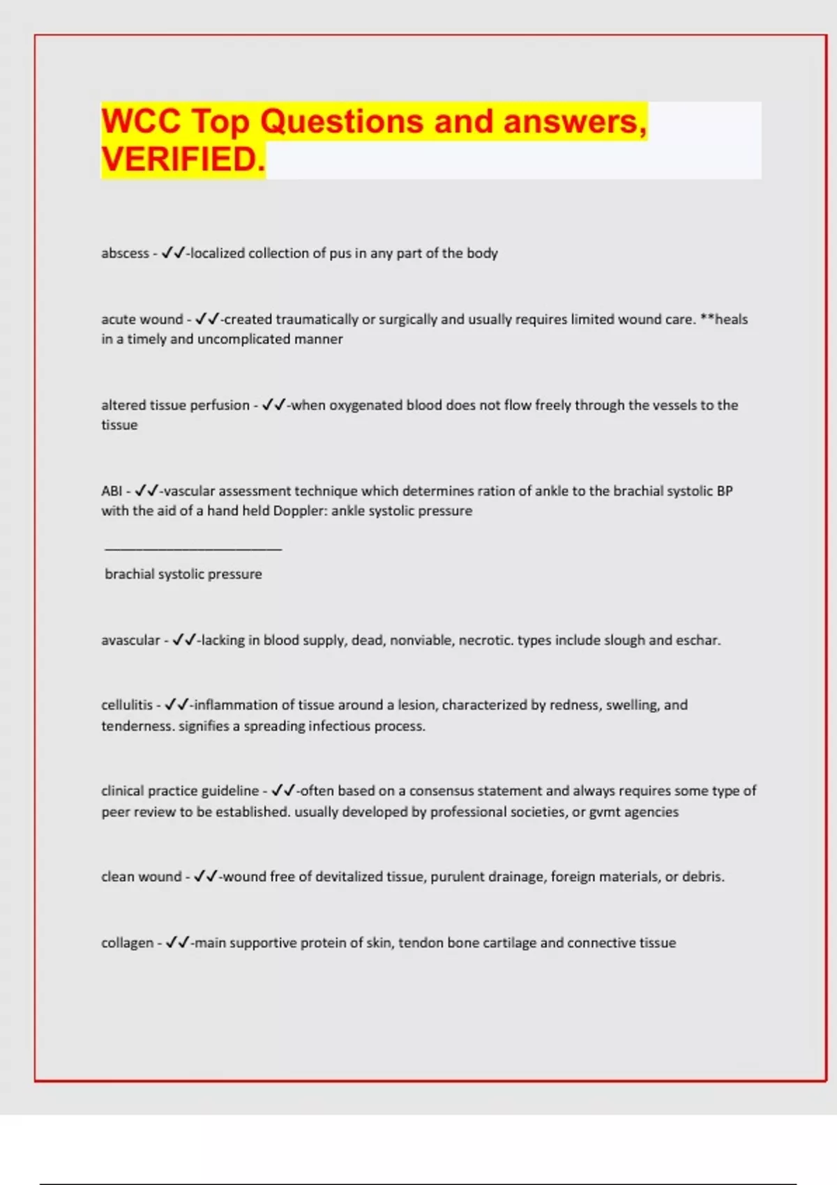 WCC Top Questions and answers, VERIFIED. abscess - -localized collection of pus in any part of the body acute wound - -created traumatically or surgically and usually requires limited wound care. **heals in a timely and uncomplicated manner altered tissue perfusion - -when oxygenated blood does not flow freely through the vessels to the tissue ABI - -vascular assessment technique which determines ration of ankle to the brachial systolic BP with the aid of a hand held Doppler: ankle systolic pressure _______________________ brachial systolic pressure avascular - -lacking in blood supply, dead, nonviable, necrotic. types include slough and eschar. cellulitis - -inflammation of tissue around a lesion, characterized by redness, swelling, and tenderness. signifies a spreading infectious process. clinical practice guideline - -often based on a consensus statement and always requires some type of peer review to be established. usually developed by professional societies, or gvmt agencies clean wound - -wound free of devitalized tissue, purulent drainage, foreign materials, or debris. collagen - -main supportive protein of skin, tendon bone cartilage and connective tissue