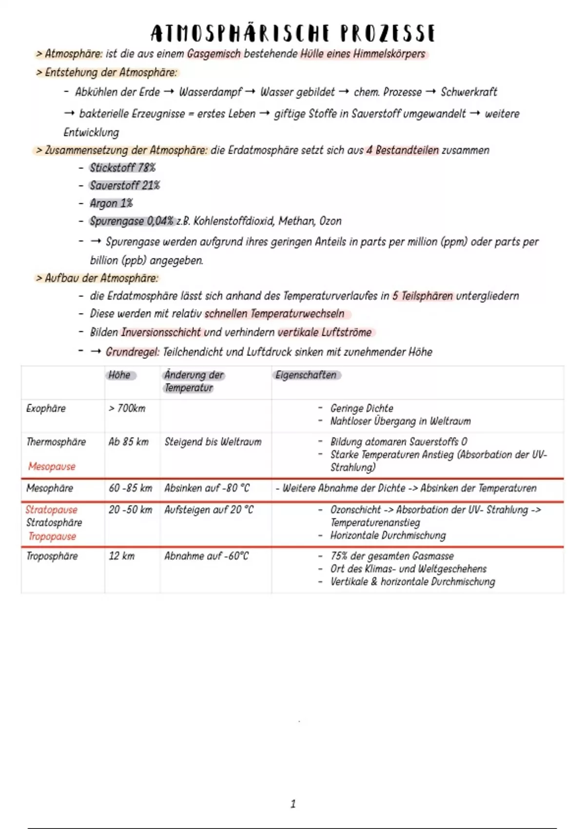 - die Erdatmosphäre lässt sich anhand des Temperaturverlaufes in 5 Teilsphären untergliedern
