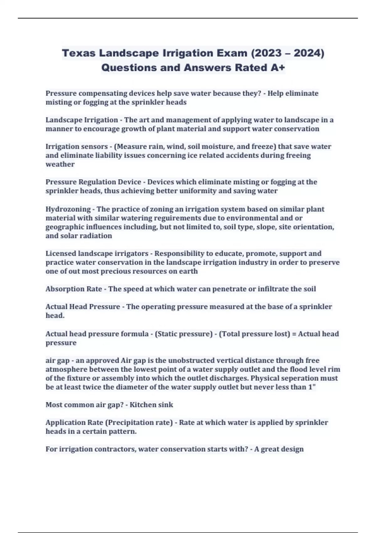 Texas Landscape Irrigation Exam (2023 – 2024) Questions and Answers Rated A+