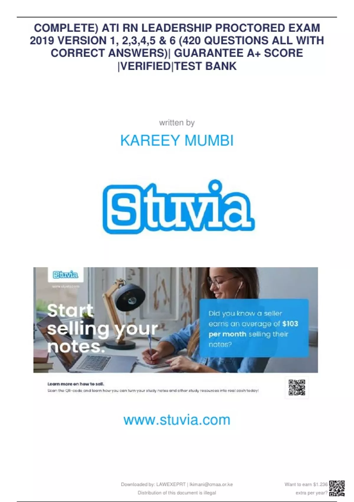 COMPLETE) ATI RN LEADERSHIP PROCTORED EXAM 2019 VERSION 1, 2,3,4,5 & 6 (420 QUESTIONS ALL WITH CORRECT ANSWERS) GUARANTEE A+ SCORE VERIFIEDTEST BANK