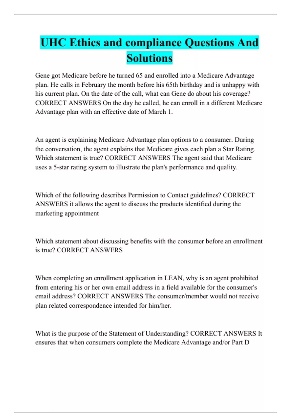 UHC Ethics and compliance Questions And Solutions