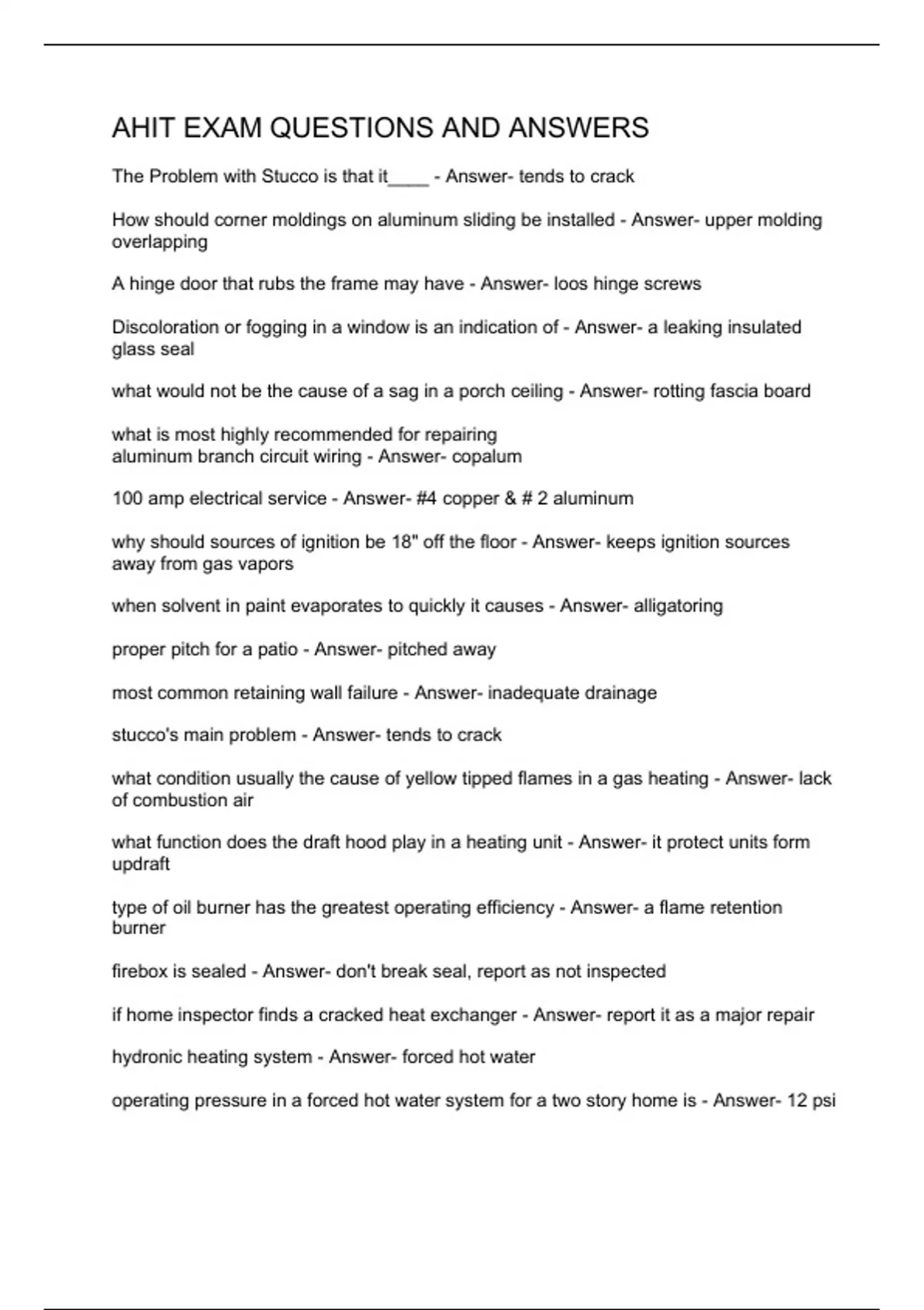 The Problem with Stucco is that it____ - Answer- tends to crack How should corner moldings on aluminum sliding be installed - Answer- upper molding overlapping A hinge door that rubs the frame may have - Answer- loos hinge screws Discoloration or fogging in a window is an indication of - Answer- a leaking insulated glass seal what would not be the cause of a sag in a porch ceiling - Answer- rotting fascia board what is most highly recommended for repairing aluminum branch circuit wiring - Answer- copalum 100 amp electrical service - Answer- #4 copper & # 2 aluminum why should sources of ignition be 18" off the floor - Answer- keeps ignition sources away from gas vapors when solvent in paint evaporates to quickly it causes - Answer- alligatoring proper pitch for a patio - Answer- pitched away most common retaining wall failure - Answer- inadequate drainage stucco's main problem - Answer- tends to crack what condition usually the cause of yellow tipped flames in a gas heating - Answer- lack of combustion air what function does the draft hood play in a heating unit - Answer- it protect units form updraft type of oil burner has the greatest operating efficiency - Answer- a flame retention burner firebox is sealed - Answer- don't break seal, report as not inspected if home inspector finds a cracked heat exchanger - Answer- report it as a major repair hydronic heating system - Answer- forced hot water operating pressure in a forced hot water system for a two story home is - Answer- 12 psi