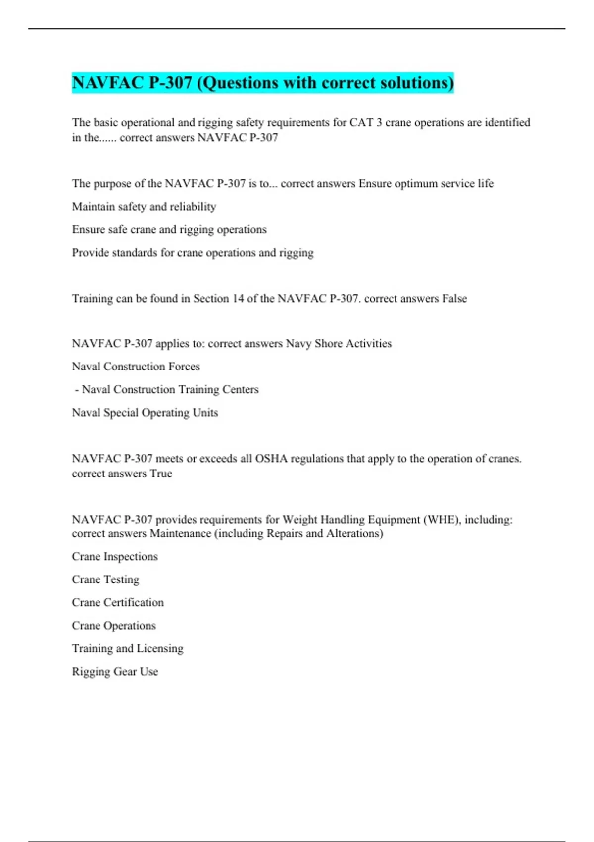 The basic operational and rigging safety requirements for CAT 3 crane operations are identified in the...... correct answers NAVFAC P-307 The purpose of the NAVFAC P-307 is to... correct answers Ensure optimum service life Maintain safety and reliability Ensure safe crane and rigging operations Provide standards for crane operations and rigging Training can be found in Section 14 of the NAVFAC P-307. correct answers False NAVFAC P-307 applies to: correct answers Navy Shore Activities Naval Construction Forces - Naval Construction Training Centers Naval Special Operating Units NAVFAC P-307 meets or exceeds all OSHA regulations that apply to the operation of cranes. correct answers True NAVFAC P-307 provides requirements for Weight Handling Equipment (WHE), including: correct answers Maintenance (including Repairs and Alterations) Crane Inspections Crane Testing Crane Certification Crane Operations Training and Licensing Rigging Gear Use