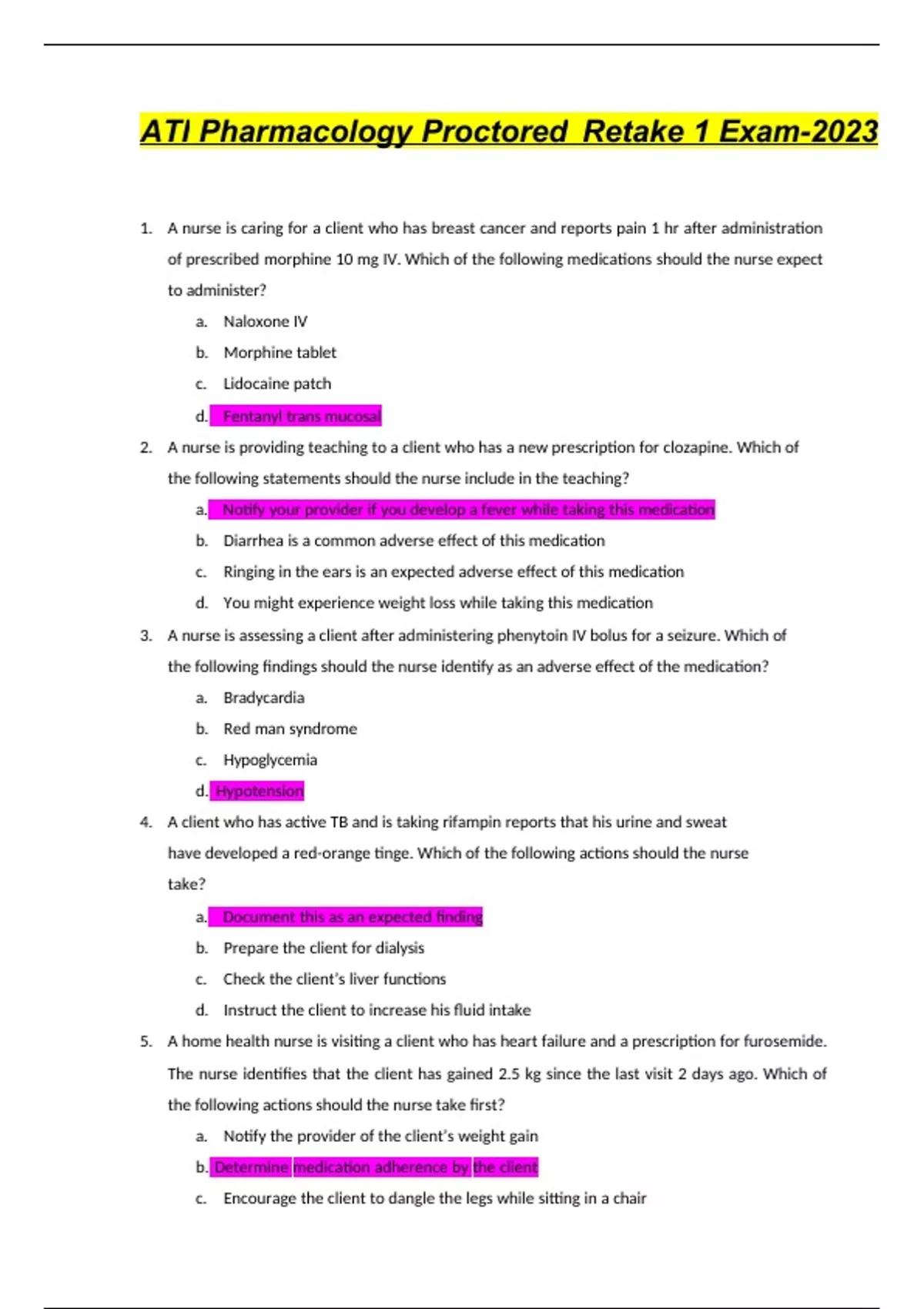 ATI Pharmacology Proctored Retake 1 Exam-2023 1. A nurse is caring for a client who has breast cancer and reports pain 1 hr after administration of prescribed morphine 10 mg IV. Which of the following medications should the nurse expect to administer? a. Naloxone IV b. Morphine tablet c. Lidocaine patch d. Fentanyl trans mucosal 2. A nurse is providing teaching to a client who has a new prescription for clozapine. Which of the following statements should the nurse include in the teaching? a. Notify your provider if you develop a fever while taking this medication b. Diarrhea is a common adverse effect of this medication c. Ringing in the ears is an expected adverse effect of this medication d. You might experience weight loss while taking this medication 3. A nurse is assessing a client after administering phenytoin IV bolus for a seizure. Which of the following findings should the nurse identify as an adverse effect of the medication? a. Bradycardia b. Red man syndrome c. Hypoglycemia d. Hypotension