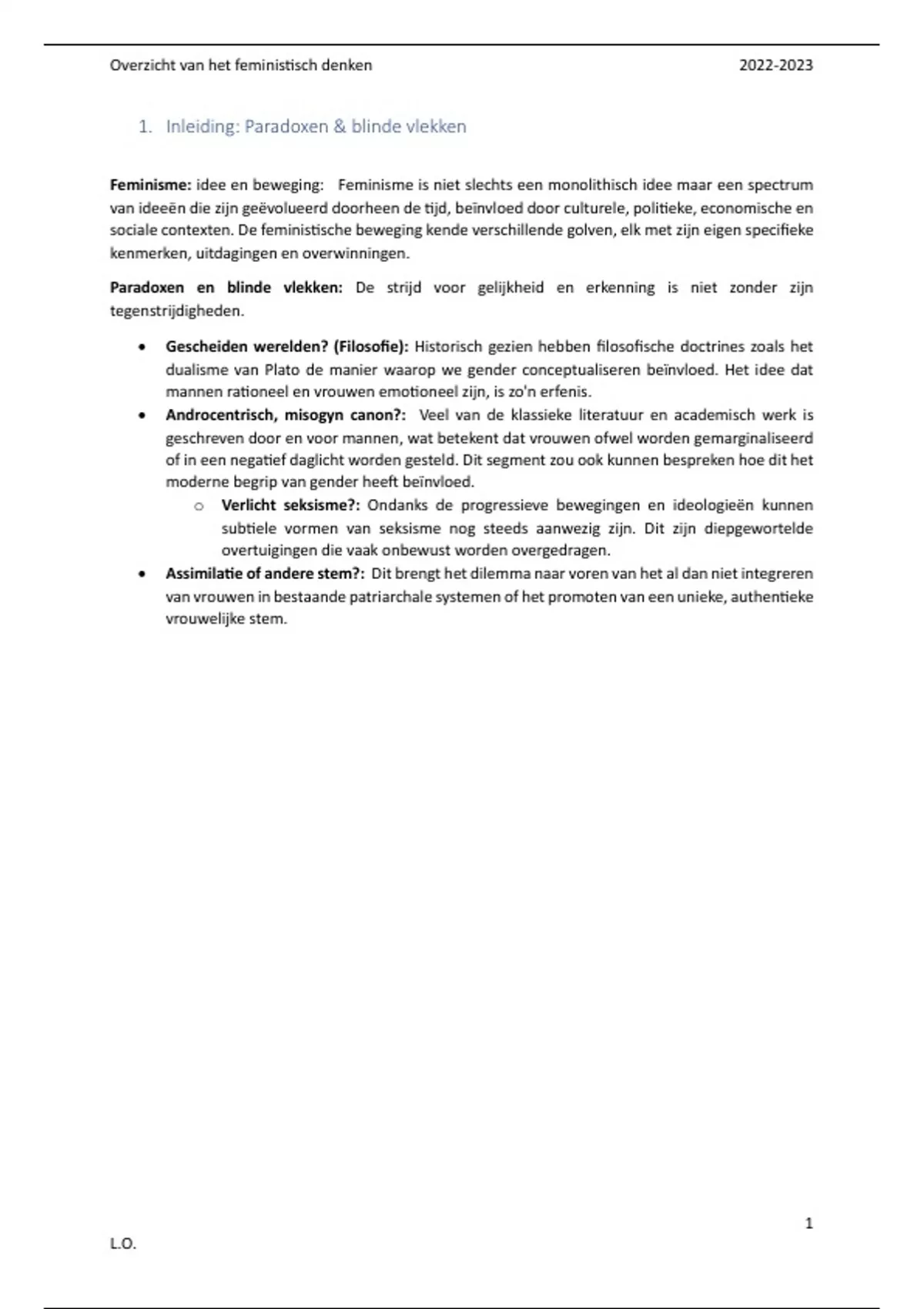 Samenvatting van 11 pagina's voor het vak Overzicht van het feministisch denken aan de VUB (Beknopt geschreven)
