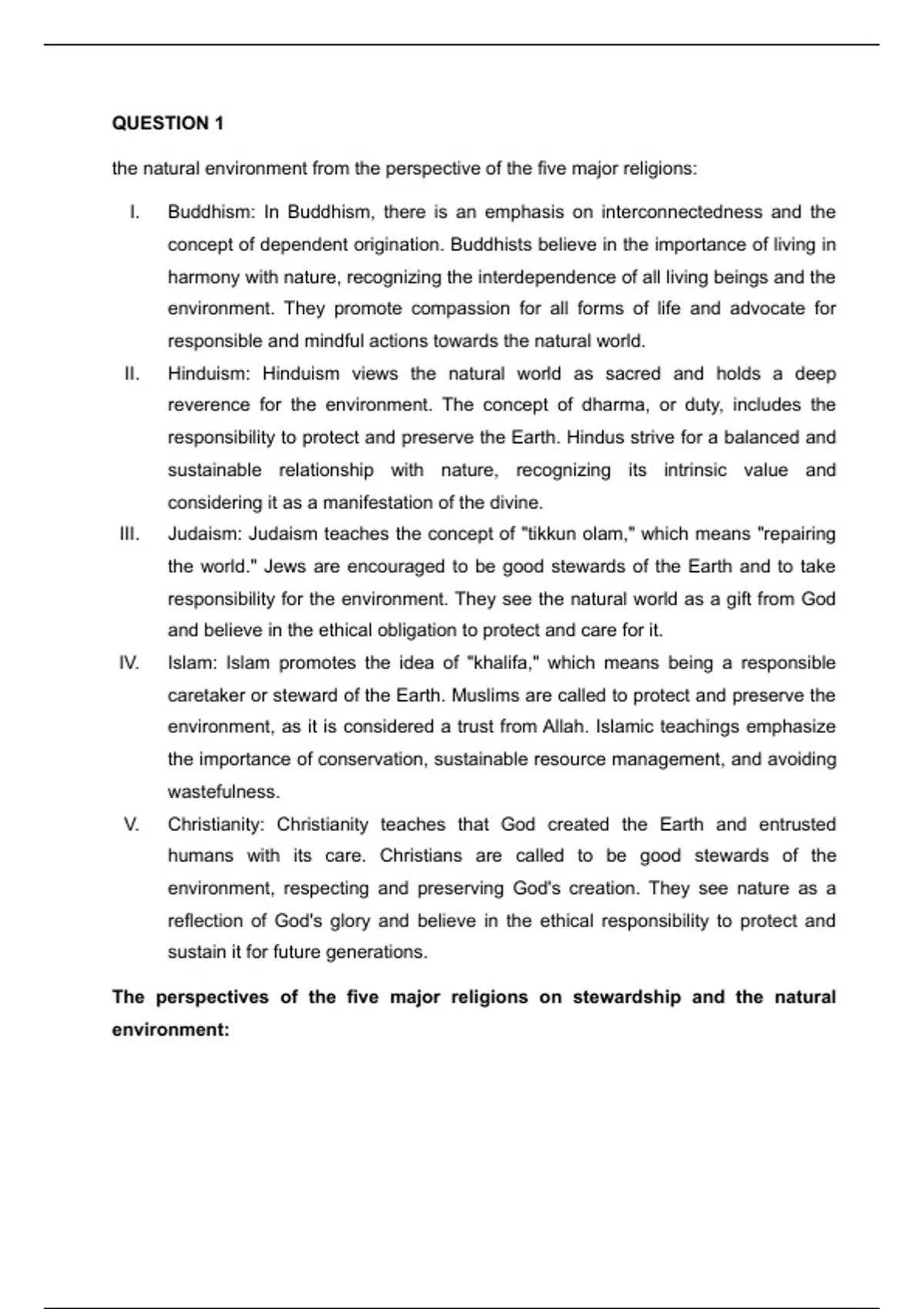 The perspectives of the five major religions on stewardship and the natural