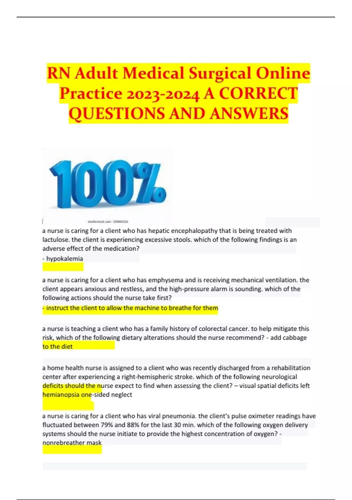 RN ADULT MEDICAL SURGICAL EXAM PACKAGE DEAL LATEST 2023-2024 CONTAINS ALL RN ADULT MEDICAL SURGICAL ACTUAL QUESTIONS WITH VERIFIED ANSWERS FOR 2024 EXAMS GRADED A.