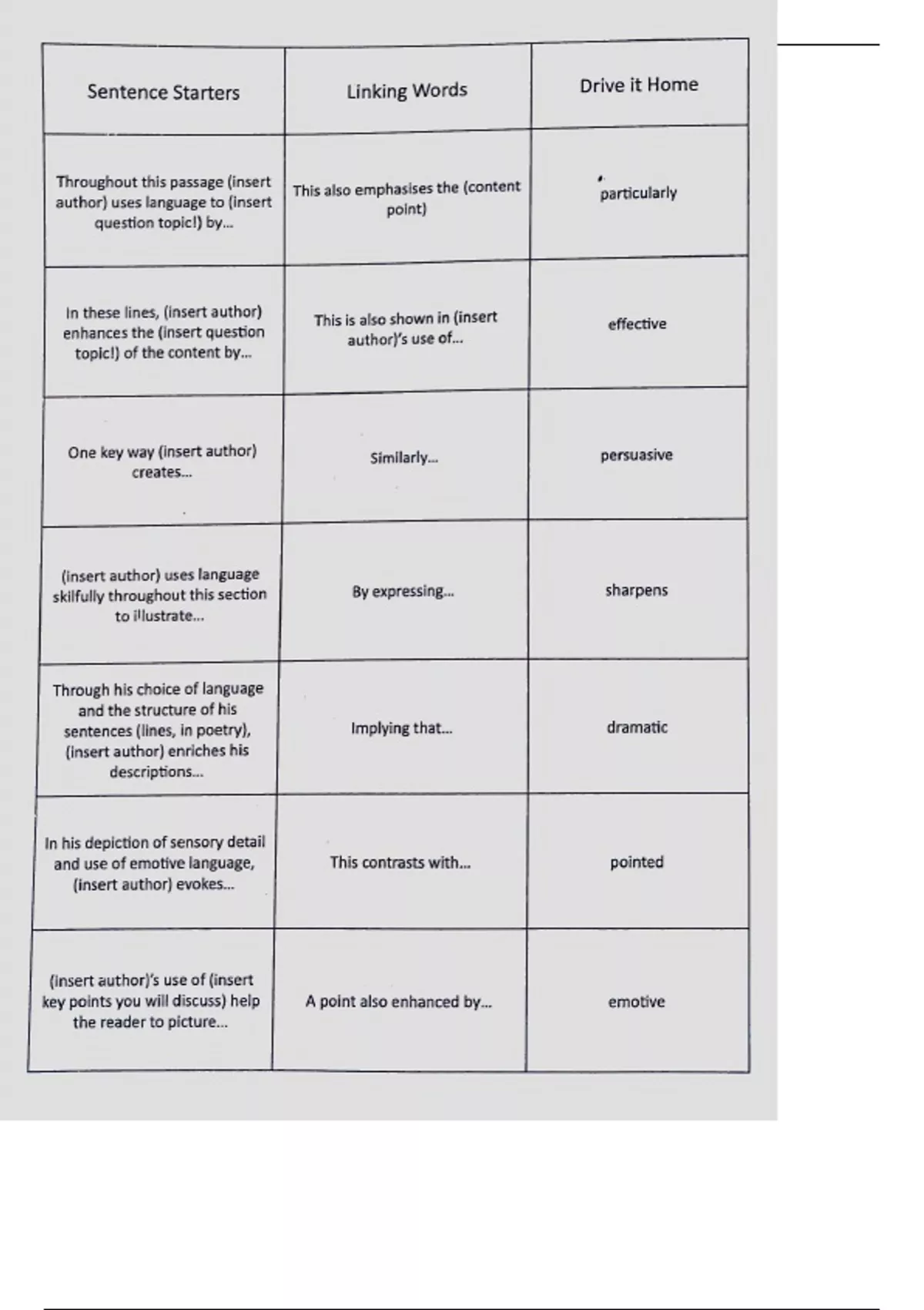 Sentence starters, sentence structures, linking words, and emphasis words provided for writing English analysis essays.