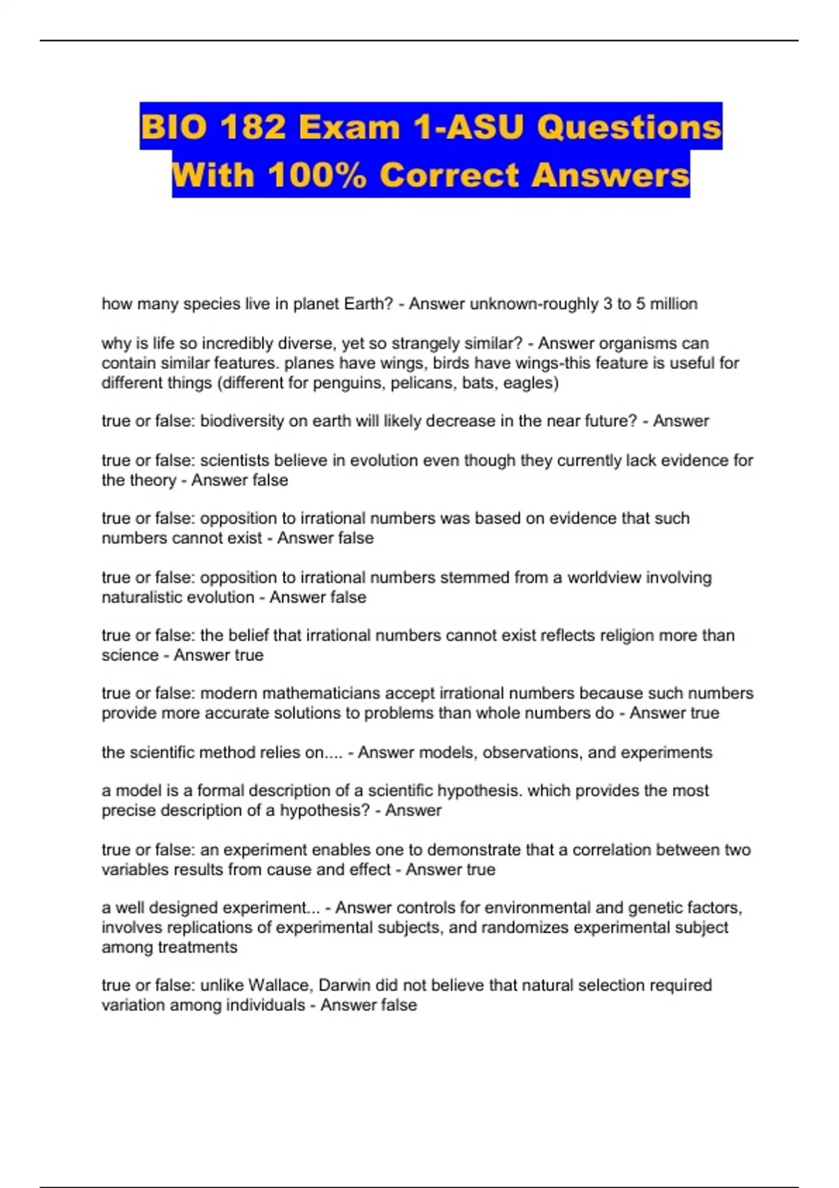 BIO 182 Exam 1-ASU Questions With 100% Correct Answers