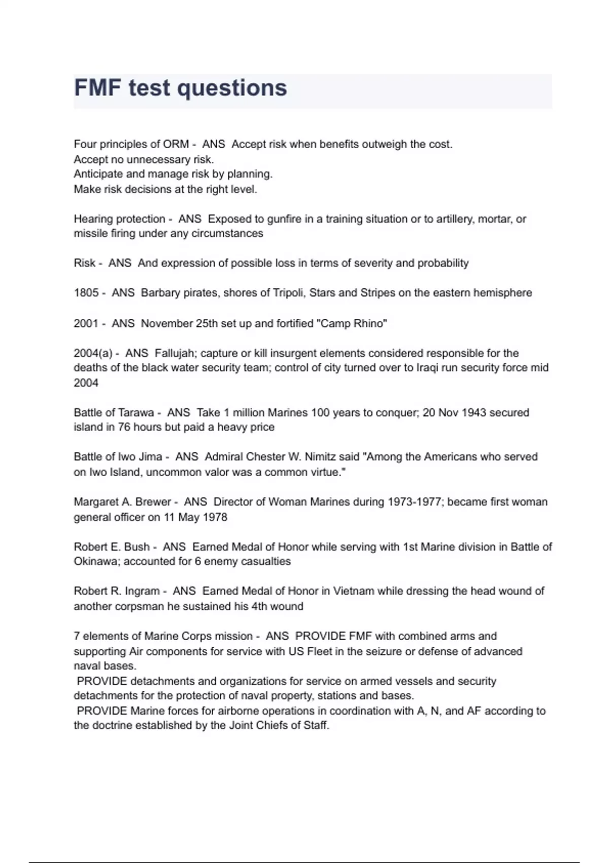 FMF Test Questions And Answers All Verified 2023 Four principles of ORM - ANS Accept risk when benefits outweigh the cost. Accept no unnecessary risk. Anticipate and manage risk by planning. Make risk decisions at the right level. Hearing protection - ANS Exposed to gunfire in a training situation or to artillery, mortar, or missile firing under any circumstances Risk - ANS And expression of possible loss in terms of severity and probability 1805 - ANS Barbary pirates, shores of Tripoli, Stars and Stripes on the eastern hemisphere 2001 - ANS November 25th set up and fortified "Camp Rhino" 2004(a) - ANS Fallujah; capture or kill insurgent elements considered responsible for the deaths of the black water security team; control of city turned over to Iraqi run security force mid 2004 Battle of Tarawa - ANS Take 1 million Marines 100 years to conquer; 20 Nov 1943 secured island in 76 hours but paid a heavy price Battle of Iwo Jima - ANS Admiral Chester W. Nimitz said "Among the Americans who served on Iwo Island, uncommon valor was a common virtue." Margaret A. Brewer - ANS Director of Woman Marines during ; became first woman general officer on 11 May 1978 Robert E. Bush - ANS Earned Medal of Honor while serving with 1st Marine division in Battle of Okinawa; accounted for 6 enemy casualties Robert R. Ingram - ANS Earned Medal of Honor in Vietnam while dressing the head wound of another corpsman he sustained his 4th wound 7 elements of Marine Corps mission - ANS PROVIDE FMF with combined arms and supporting Air components for service with US Fleet in the seizure or defense of advanced naval bases. PROVIDE detachments and organizations for service on armed vessels and security detachments for the protection of naval property, stations and bases. PROVIDE Marine forces for airborne operations in coordination with A, N, and AF according to the doctrine established by the Joint Chiefs of Staff.