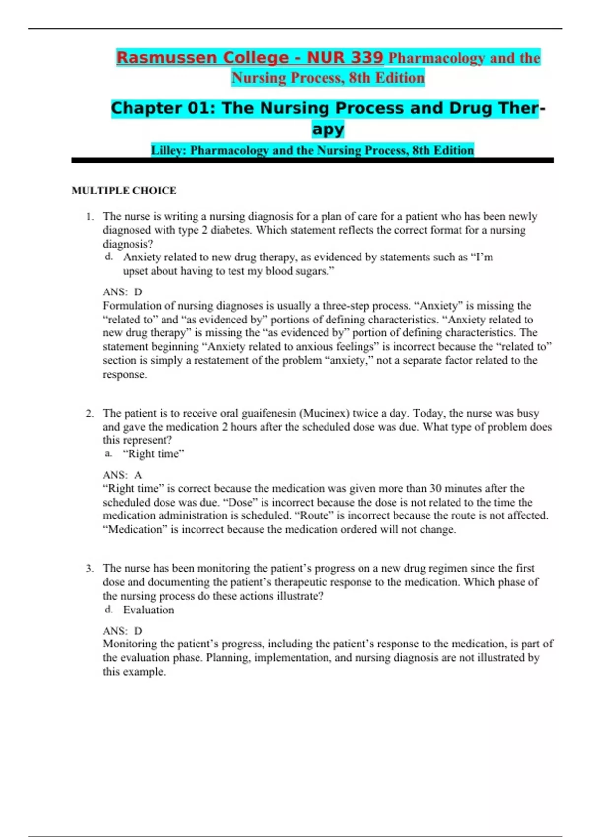 Rasmussen College - NUR 339 Pharmacology and the Nursing Process, 8th Edition Chapter 01: The Nursing Process and Drug Therapy Lilley: Pharmacology and the Nursing Process, 8th Edition MULTIPLE CHOICE 1. The nurse is writing a nursing diagnosis for a plan of care for a patient who has been newly diagnosed with type 2 diabetes. Which statement reflects the correct format for a nursing diagnosis? d. Anxiety related to new drug therapy, as evidenced by statements such as “I’m upset about having to test my blood sugars.” ANS: D Formulation of nursing diagnoses is usually a three-step process. “Anxiety” is missing the “related to” and “as evidenced by” portions of defining characteristics. “Anxiety related to new drug therapy” is missing the “as evidenced by” portion of defining characteristics. The statement beginning “Anxiety related to anxious feelings” is incorrect because the “related to” section is simply a restatement of the problem “anxiety,” not a separate factor related to the response. 2. The patient is to receive oral guaifenesin (Mucinex) twice a day. Today, the nurse was busy and gave the medication 2 hours after the scheduled dose was due. What type of problem does this represent? a. “Right time” ANS: A “Right time” is correct because the medication was given more than 30 minutes after the scheduled dose was due. “Dose” is incorrect because the dose is not related to the time the medication administration is scheduled. “Route” is incorrect because the route is not affected. “Medication” is incorrect because the medication ordered will not change. 3. The nurse has been monitoring the patient’s progress on a new drug regimen since the first dose and documenting the patient’s therapeutic response to the medication. Which phase of the nursing process do these actions illustrate? d. Evaluation ANS: D Monitoring the patient’s progress, including the patient’s response to the medication, is part of the evaluation phase. Planning, implementation, and nursing diagnosis are not illustrated by this example. 4. The nurse is assigned to a patient who is newly diagnosed with type 1 diabetes mellitus. Which statement best illustrates an outcome criterion for this patient? d. The patient will demonstrate correct blood glucose testing technique. ANS: D “Demonstrating correct blood glucose testing technique” is a specific and measurable outcome criterion. “Following instructions” and “not experiencing complications” are not specific criteria. “Adhering to new regimen” would be difficult to measure. 5. Which activity best reflects the implementation phase of the nursing process for the patient who is newly diagnosed with hypertension? a. Providing education on keeping a journal of blood pressure readings ANS: A Education is an intervention that occurs during the implementation phase. Setting goals and outcomes reflects the planning phase. Recording a drug history reflects the assessment phase. Formulating nursing diagnoses reflects analysis of data as part of planning. 6. The medication order reads, “Give ondansetron (Zofran) 4 mg, 30 minutes before beginning chemotherapy to prevent nausea.” The nurse notes that the route is missing from the order. What is the nurse’s best action? c. Contact the prescriber to clarify the route of the medication ordered. ANS: C A complete medication order includes the route of administration. If a medication order does not include the route, the nurse must ask the prescriber to clarify it. The intravenous and oral routes are not interchangeable. Holding the medication until the prescriber returns would mean that the patient would not receive a needed medication.