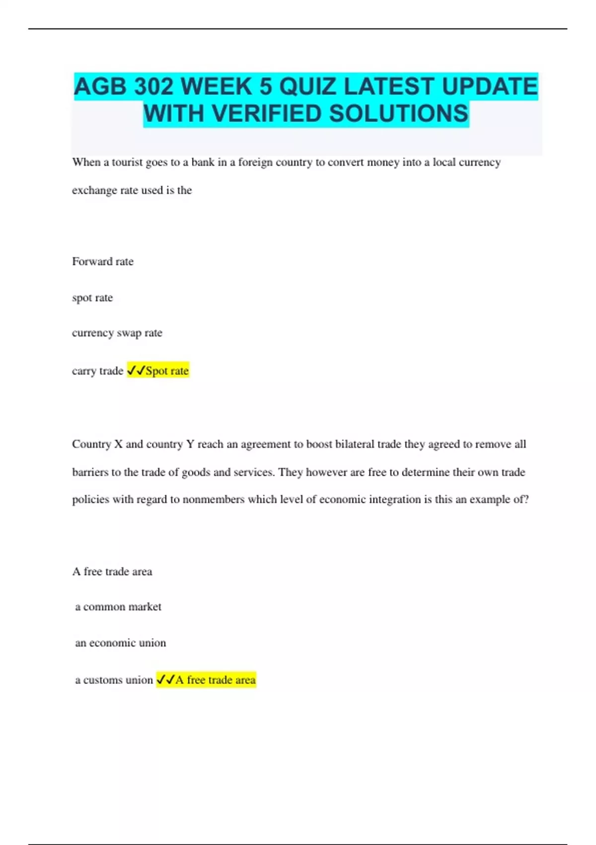 AGB 302 WEEK 5 QUIZ LATEST UPDATE WITH VERIFIED SOLUTIONS When a tourist goes to a bank in a foreign country to convert money into a local currency exchange rate used is the Forward rate spot rate currency swap rate carry trade Spot rate Country X and country Y reach an agreement to boost bilateral trade they agreed to remove all barriers to the trade of goods and services. They however are free to determine their own trade policies with regard to nonmembers which level of economic integration is this an example of? A free trade area a common market an economic union a customs union A free trade area The short term movement of funds from one currency to another in the hopes of profiting from shifts in exchange rates is known as Currency speculation currency risk mitigation currency hedging currency arbitrage Currency speculation A _____ entails even closer economic integration and cooperation than a common market. Economic union free trade area Full political union customs union Economic union An exchange rate of € = $1. 30 indicates that One euro buys $1.30 One could get 1.30 Euros for $1 euro buys $0.77 $1 is worth 1.30 euros One euro buys 1.30 dollars Which of the following is a reason why the European Union is considered an imperfect economic union? factors of production are not allowed to move freely between member countries almost all markets are heavily regulated not all members of the union have adopted the euro products and services are not allowed to move freely between member countries Not all members of the union have adopted the euro Inflation occurs when the stock of goods and services increases in the quantity of money in circulation decreases The quantity of money in circulation rises faster than the stock of goods and services output increases faster than the money supply The money supply decreases and the output increases The quantity of money in circulation rises faster than the stock of goods and services A _____ is one which prices do not reflect all available information externally convertible market speculative market efficient market inefficient market Inefficient market Which feature of a common market differentiates it from a customs union? a common external trade policy toward nonmembers ability of factors of production to move freely between members harmonization of members' tax rates a common currency Ability of factors of production to move freely between members The is primarily a consulted rather than legislative body Court of justice European commission European Parliament council of the European Union European Parliament Restrictions on external convertibility can allow domestic companies to freely invest abroad hamper foreign companies wishing to do business in that country limit domestic companies from investing abroad limit the amount of product a foreign company can produce in that country Limit domestic companies from investing abroad On average studies indicate that NAFTA's overall impact has been large but negative small but positive large and positive small and negative Small but positive From least integrated to most integrated the levels of economic integration are a common market a free trade area an economic union a customs union and a political union commons union a free trade area a common market a political union and an economic union common market, an economic union, a customs union, a free trade area and a political union. Free trade area a customs union, a common market, an economic union and a political union Free trade area, a customs union, a common market, and economic union, and a political union. To ensure that a free trade agreement does not result in trade diversion, which of the following have to come within the scope of the WTO? Energy markets Services nontariff barriers tax rates Nontariff barriers The risk that arises from volatile changes in exchange rates is known as Foreign exchange risk economic exposure transactional exposure translational exposure Foreign exchange risk The ________ is a global network of banks, brokers, and foreign exchange dealers connected by electronic communication systems. Foreign market database foreign exchange market global marketplace united global database Foreign exchange market A __________ is the simultaneous purchase and sale of a given amount of foreign exchange for two different values Currency swap arbitrage spot exchange carry trade Currency swap The rate at which one country is converted into another is known as the _____________ Exchange rate currency swap rate fluctuation rate carryover rate Exchange rate A political benefit of economic integration is that it: Reduces the potential for violent conflict. Enables participants to achieve gains from the free flow of trade. Enables participants to achieve gains from the free flow of investment. Allows countries to specialize in production of goods and services that they can produce most efficiently. Reduces the potential for violent conflict The movement toward regional economic integration has been most successful in _________ Central America Africa Asia Europe Europe