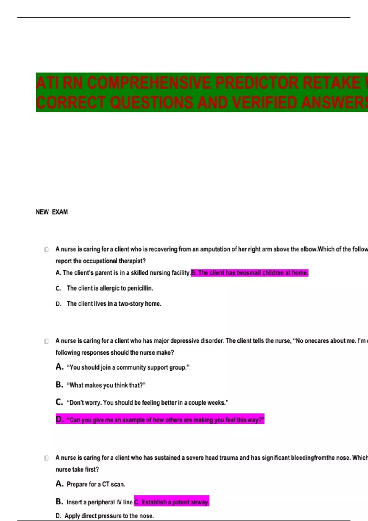 ATI RN COMPREHENSIVE PREDICTOR RETAKE WTH 100% CORRECT QUESTIONS AND VERIFIED ANSWERS NEW EXAM A nurse is caring for a client who is recovering from an amputation of her right arm above the elbow.Which of the following information should the nurse report the occupational therapist? A. The client’s parent is in a skilled nursing facility.B. The client has twosmall children at home. C. The client is allergic to penicillin. D. The client lives in a two-story home. A nurse is caring for a client who has major depressive disorder. The client tells the nurse, “No onecares about me. I’m completely alone.” Which of the following responses should the nurse make? A. “You should join a community support group.” B. “What makes you think that?” C. “Don’t worry. You should be feeling better in a couple weeks.” D. “Can you give me an example of how others are making you feel this way?” A nurse is caring for a client who has sustained a severe head trauma and has significant bleedingfromthe nose. Which of the following actions should the nurse take first? A. Prepare for a CT scan. B. Insert a peripheral IV line.C. Establish a patent airway. D. Apply direct pressure to the nose. A nurse is reviewing the rhythm strip of a client who is experiencing sinus arrhythmia. Which of thefollowing findings should the nurse expect? A. Inconsistent P wave formation. B. Ventricular and atrial rates 120/min C. P-R intervals of 0.30 seconds D. P to QRS ratio 1:1 A nurse is admitting a client who has dementia to a long-term care facility. The client tells the nursethat she lived in this facility years ago and took care of all the residents by herself. The nurse shoulddocument this as which of the following findings? A. Confabulation B. Agnosia C. Projection D. Perseveration A nurse is reviewing home recommendations with a client who is postoperative following kneesurgery. Which of the following recommendations should the nurse make? A. Place a handrail in the entryway of the house. B. Place a towel on the floor outside of the shower. C. Ensure that all area rugs are rubber-backed. D. Wear slippers with cloth soles. A nurse is assessing a client who has received an antibiotic. The nurse should identify which of thefollowing findings as an indication of a possible allergic reaction to the medication? A. Bradycardia B. Headache C. Joint pain D. Hypotension A nurse on a mental health unit is caring for a client who has schizophrenia and is experiencingauditory hallucinations telling them to hurt others. The client is refusing to take anti-psychoticmedication. Which of the following responses should the nurse make? A. “You should plan to take this medication for a few weeks.” B. “You will regret it if you do not take this medication.” C. “This medication will help you respond to the voices. D. “This medication will help you stop the voices you are hearing.” A nurse is providing care for a patient who has depression and is to have electroconvulsive therapy.Which of the following conditions should the nurse identify as increasing the client’s risk for complications? A. Hyperthyroidism B. Renal calculi C. Diabetes mellitus D. Cardiac dysrhythmias A nurse is reviewing the laboratory results of a client who has rheumatoid arthritis. Which of thefollowing findings should the nurse report to the provider? A. WBC count 8,000/mm B. Platelets 150,000/mm C.Aspartate aminotransferase 10 units/LD. Erythrocytesedimentation 75 mm/hr A nurse is caring for a client who has a tension pneumothorax. Which of the followingmanifestationsshould the nurse expect? A. Paradoxical chest movement B. Bilateral crackles C. Asymmetry of the chest D. Blood-tinged sputum A nurse is caring for a client who is at 11 weeks of gestation. Which of the followingimmunizationsshould the nurse recommend? A. Human papillomavirusB. Influenza C. Measles, mumps and rubella D. Varicella A nurse in a pediatric clinic is reviewing the laboratory test results of a school-age child.Which of thefollowing findings should the nurse report to the provider? A. Hct 40% B. Hgb 12.5 g/dL C. Platelets 250,000/mmD. WBC 14,000/mm A nurse is assessing a client who is receiving packed RBCs. Which of the followingindicates fluidoverload? A. Low-back pain B. Thready pulse C. HypotensionD. Dyspnea A nurse is preparing to administer betamethasone to a client who is 25 weeks of gestation and has preterm labor. Which of the following findings should the nurse identify as an adverse effect of this medication? A. Hyperglycemia B. Uterine contractions C. Proteinuria D. Hypotension A nurse is preparing to obtain a blood sample from a client who has a central venous catheter. Whichofth A. e following actions should the nurse take? (SATA) A.Apply a tourniquet above the catheter insertion site. B. Access the catheter using a large bore needle. C. Aspirate for blood return to access catheter patency. D. Flush the catheter with 0.9% sodium chloride E. Apply force when resistance is met while flushing the catheter. A nurse is preparing to perform a dressing change on a preschooler. Which of the following actionsshould the nurse take to prepare the child for the procedure? A. Explain in simple terms how the procedure will affect the child. B. Ask the parents to wait outside the room during the procedure. C. Limit teaching sessions about the procedure to 20 min. D. Instruct the child in deep-breathing methods prior to the procedure. A nurse is performing wound care for a client who has an abdominal incision. Which of the followingtechniques should the nurse implement? A. Irrigate the wound using a 10-mL syringe. B. Cleanse the wound starting at the bottom and moving upward. C. Cleanse the insertion site of the drain using a circular motion towards the center.D. Irrigatethe wound with a low-pressure flow of solution. A nurse on an antepartum unit is prioritizing care for multiple clients. Which of the following clientsshould the nurse see first? A. A client who is a